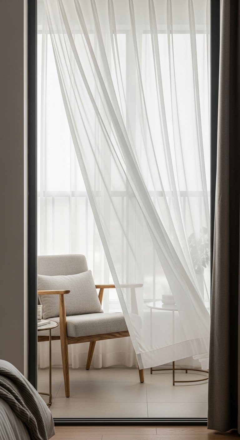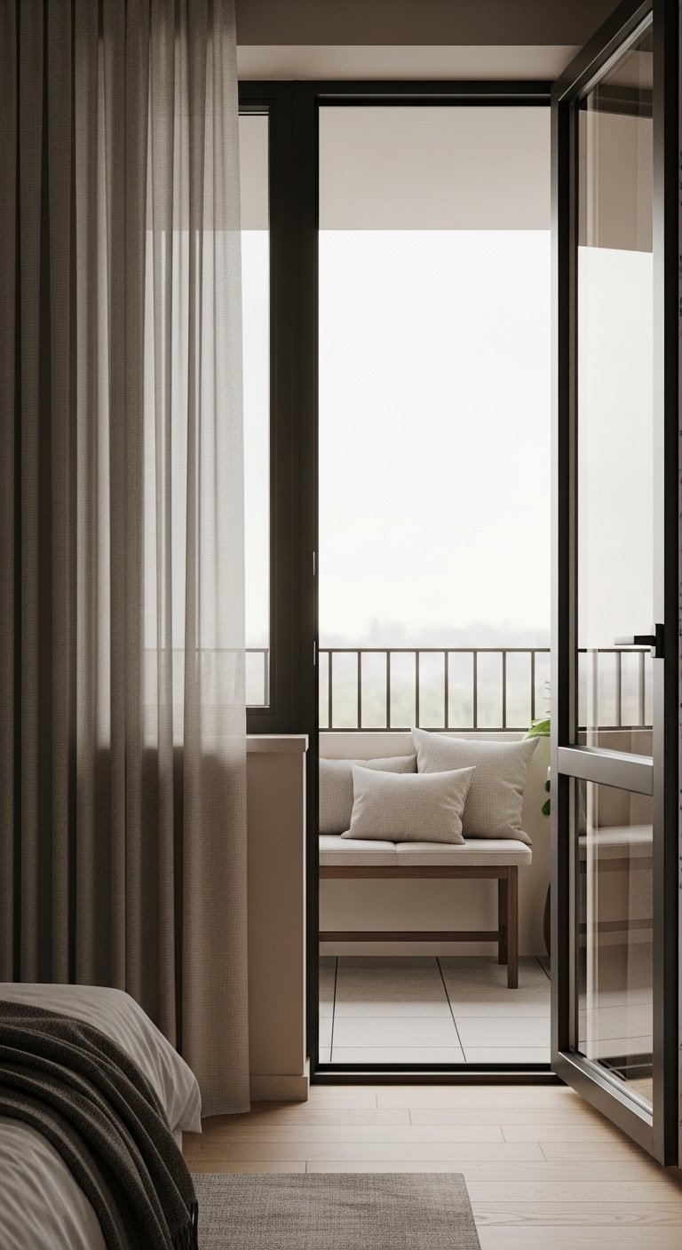 Add soft movement and a sense of privacy by hanging sheer curtains around your balcony. Choose light fabrics in white or soft beige so they let sunlight pass through while still creating a gentle barrier. When the breeze moves them, the whole space feels more relaxed and calm. Use simple curtain rods or tension wires to install them without heavy fixtures. Pair this with a small seating setup like a chair and a side table to keep the look balanced. The curtains also help filter harsh sunlight during the day, making the balcony more comfortable to use. At night, they create a soft enclosed feeling that makes the space feel like a private nook connected to your bedroom.