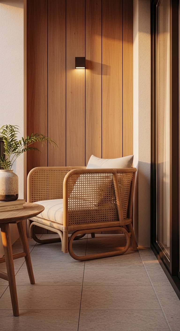 Create a warm and grounded look by using rattan or cane furniture. These materials add texture without making the space feel heavy. A small rattan chair paired with a simple side table is enough to build a cozy setup. Choose cushions in soft cream or light brown to keep the look balanced. Add a warm light source like a small lamp or soft string lights to enhance the natural tones. This combination works especially well in the evening when the light hits the textures and creates a calm atmosphere. Keep accessories minimal so the materials stand out. This kind of balcony feels relaxed, slightly rustic, and very easy to live with every day.