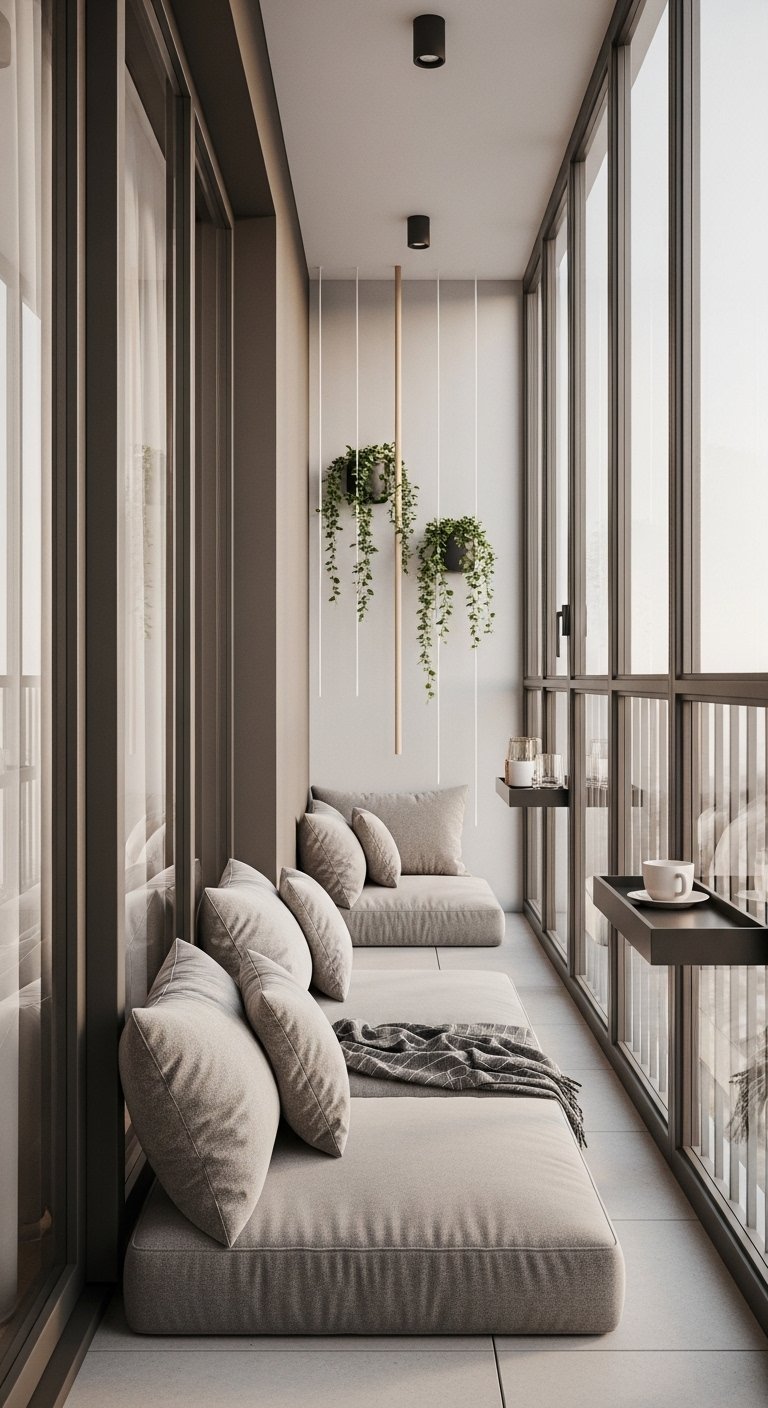 If your balcony is long and narrow, use a layout that follows the shape instead of fighting it. Place a slim bench or a row of floor cushions along one side, leaving the walkway clear. This keeps the space usable without feeling tight. Add a narrow shelf or railing tray for small items like a cup or a plant. Use vertical elements like hanging lights or wall planters to draw the eye upward and make the space feel taller. Stick to light colors so the area does not feel closed in. This layout makes the most of limited space while still creating a comfortable spot to sit and relax.