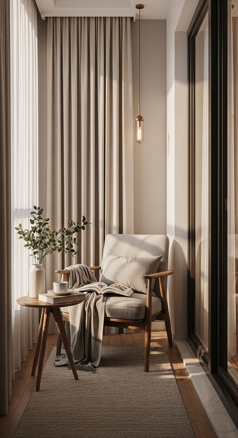 Turn your balcony into a quiet reading corner by focusing on comfort and light. Choose a supportive chair with a soft cushion and place it where natural light falls during the day. Add a small side table for books and a drink so everything you need is within reach. Use a light throw or a small blanket to make the space usable in cooler weather. If the light is too strong, add a sheer curtain or a simple shade to soften it. This setup works well because it gives the balcony a clear purpose. Instead of being unused space, it becomes a place you return to daily for quiet time.