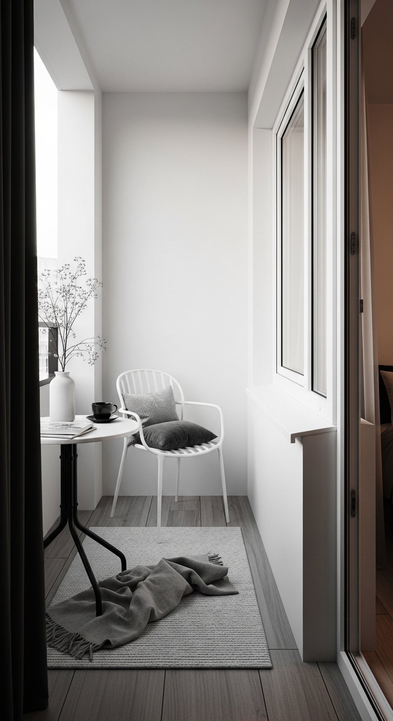 Create a clean and modern look by sticking to a monochrome palette like black, white, and soft grey. Use contrast carefully so the space feels calm rather than sharp. For example, pair a white chair with a dark cushion or a black table with light decor. Keep lines simple and avoid too many patterns. Add one or two textured elements like a woven rug or a soft fabric throw to prevent the space from feeling flat. Lighting plays an important role here, so use warm lights to soften the contrast. This idea works well if you prefer a more structured and uncluttered look while still keeping the balcony comfortable.