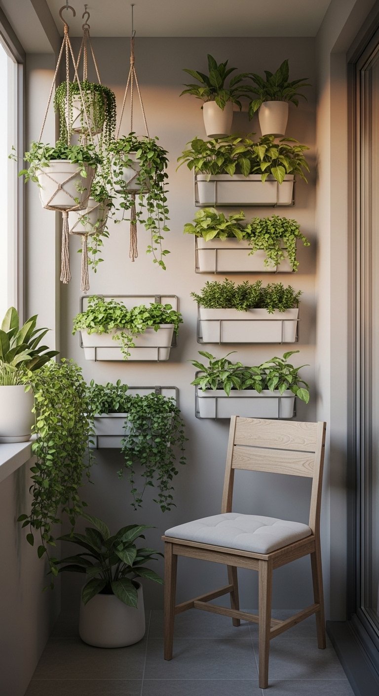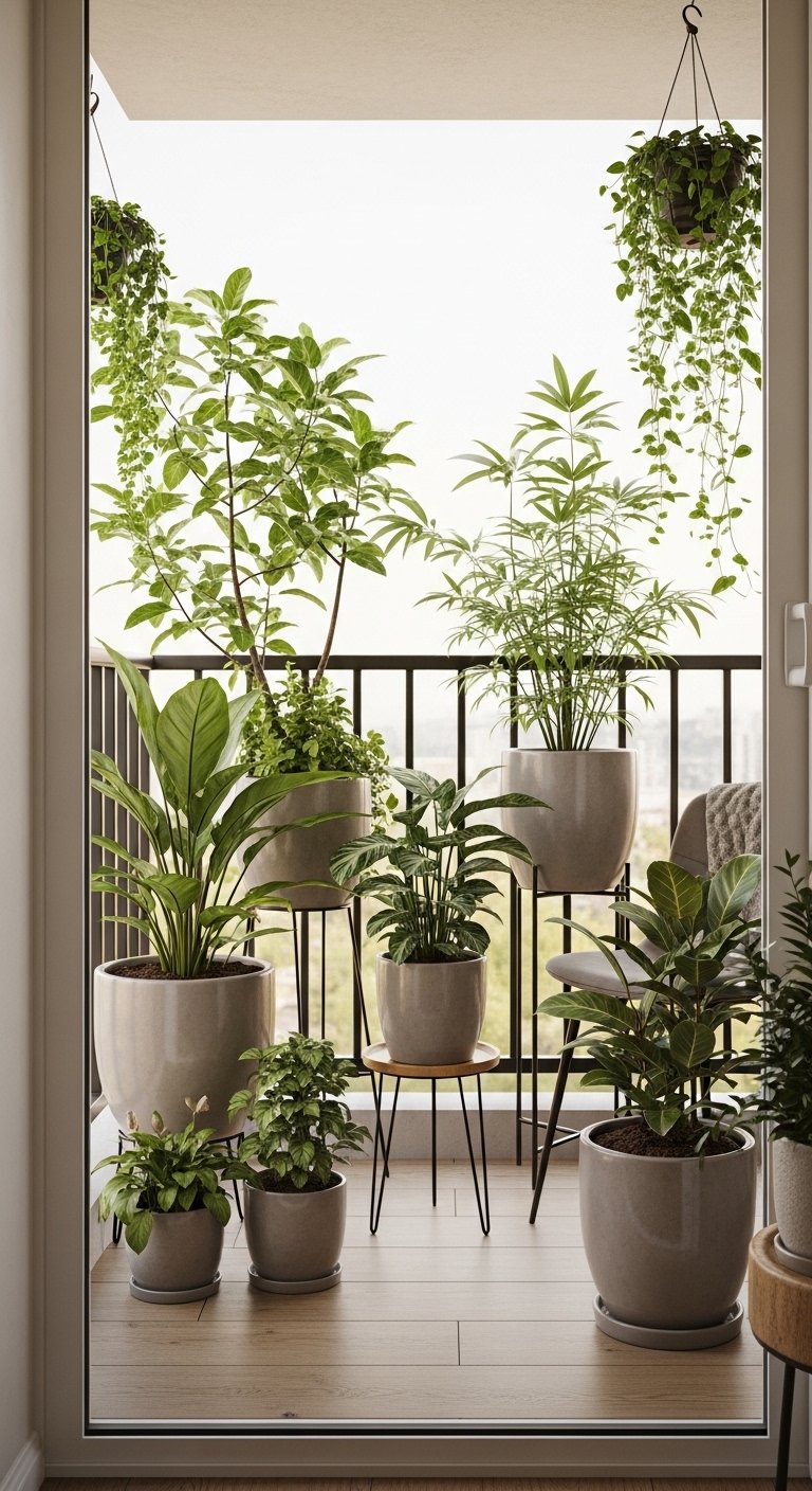 Instead of a full plant wall, create depth using layered pots at different heights. Place larger pots on the floor, medium ones on stands, and smaller ones on the railing or a shelf. This creates a natural flow without overwhelming the space. Choose plants with different leaf shapes and sizes to add variety. Keep seating simple with a small chair tucked into one corner so the greenery remains the focus. This setup feels lively and refreshing while still leaving enough room to sit and enjoy the space. It is a practical way to bring nature closer without needing a large area.
