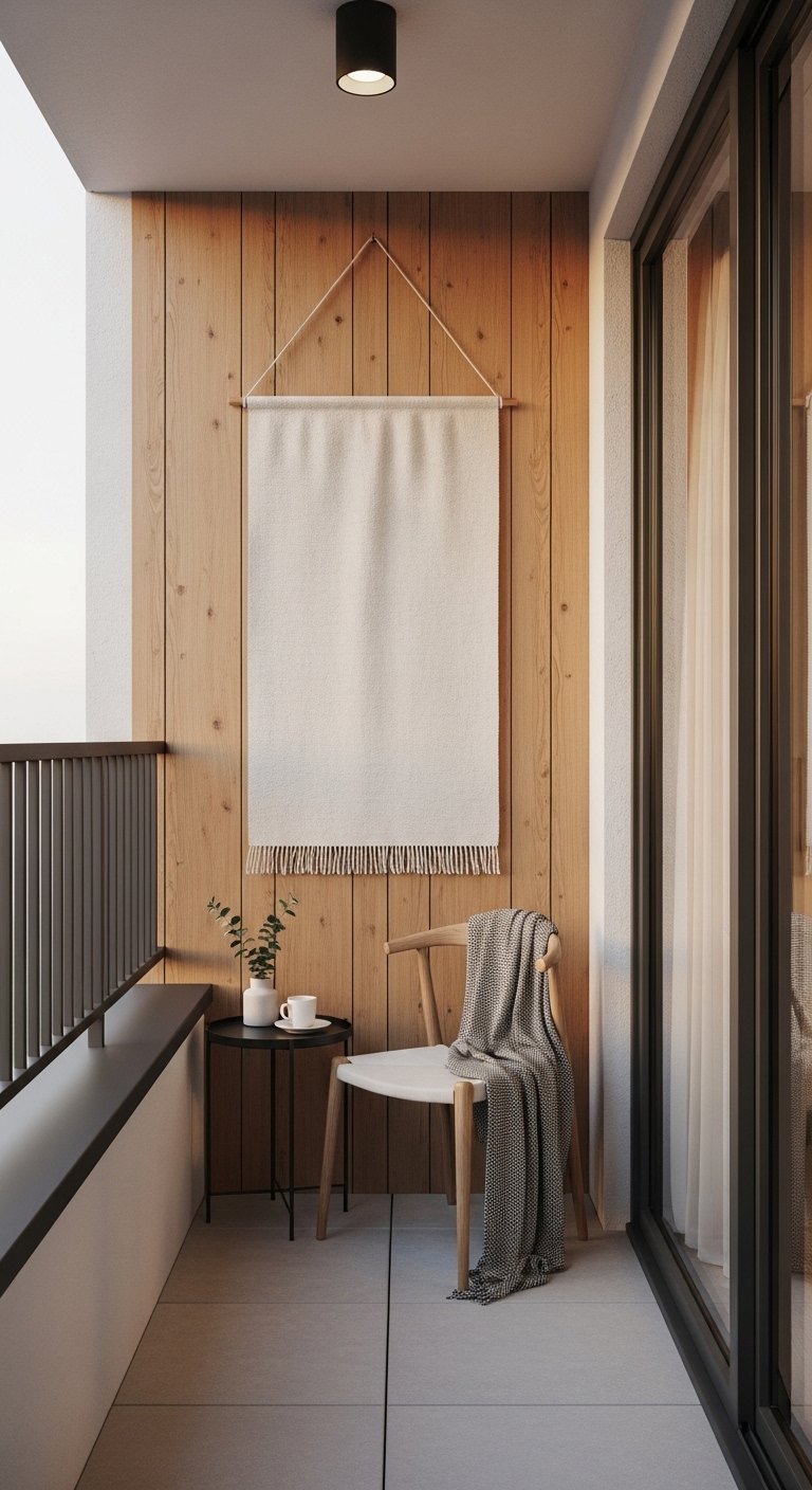 Add interest to your balcony by focusing on one wall instead of filling the whole space. Use textured paint, wooden panels, or even a simple fabric hanging to create a soft focal point. This draws attention without adding clutter. Keep the rest of the balcony simple with a chair and a small table. Use colors that complement the wall so everything feels connected. Lighting can enhance the texture, especially in the evening when shadows add depth. This idea works well for small balconies because it creates visual interest without taking up floor space.