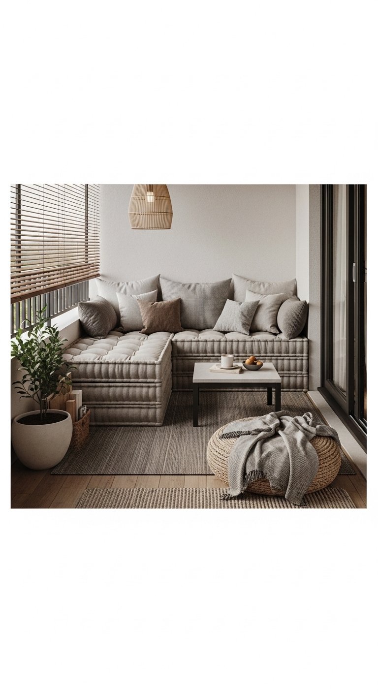 Create the feel of built in seating without permanent changes by arranging cushions along the edges of your balcony. Use firm base cushions and softer ones on top to build comfort. This makes the space feel structured and cozy at the same time. Add a low table in the center so the layout feels complete. Use a rug to define the area and keep everything visually connected. Stick to a consistent color palette so the setup looks intentional. This idea works well for relaxing, casual seating and even small gatherings.