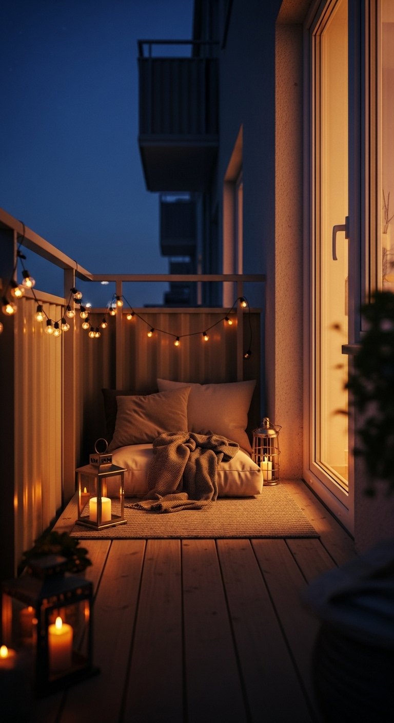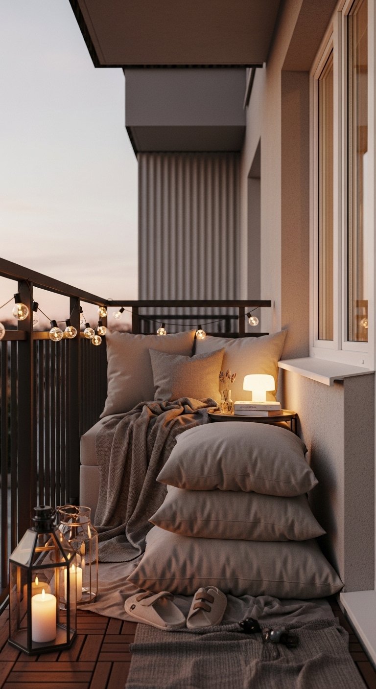 Design your balcony around how it feels in the evening. Use warm toned lights, soft fabrics, and comfortable seating to create a space that helps you slow down. Add a thick throw blanket and a few cushions so you can stay outside longer without discomfort. Keep colors warm and muted, like soft brown, beige, or dusty tones. Avoid bright or harsh lighting and focus on a gentle glow instead. This setup turns your balcony into a quiet end of day retreat where you can relax before going to sleep. It is simple, practical, and easy to maintain.
