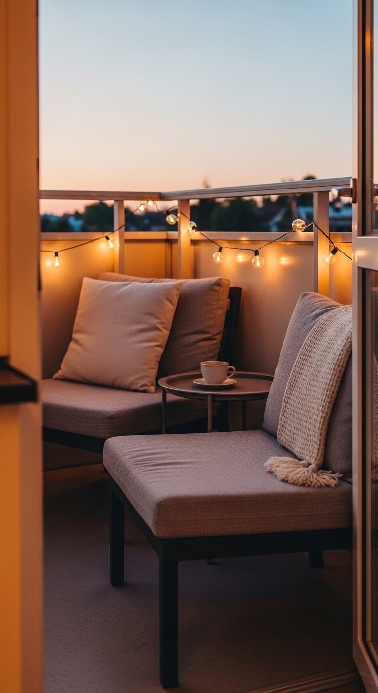 If you prefer a more structured layout, create a simple two chair setup that feels intimate and easy to use. Choose compact chairs with soft cushions in neutral or muted tones, then place them facing slightly inward to encourage conversation or quiet relaxation. A small round table in between makes the space practical without taking up too much room. Lighting makes a big difference here. Wrap warm string lights along the railing or hang them above to create a gentle glow that feels inviting after sunset. You can also add a small lantern on the table for an extra layer of light. This kind of setup works well for morning coffee, evening chats, or even a quiet moment alone. Keep the styling minimal so the space stays clean and easy to maintain.