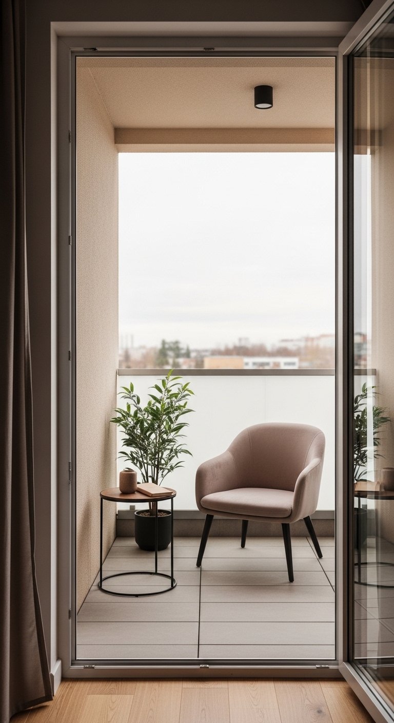 Make your balcony useful during the day by turning it into a small breakfast corner. Use a foldable wall mounted table or a slim table that does not take up too much space. Pair it with one or two lightweight chairs that you can move easily. Keep the styling simple with a small tray, a cup, and maybe a tiny plant. This setup works well for morning coffee or a quick meal without leaving your room. When not in use, you can fold or move the furniture to free up space. It is a practical idea that makes even a small balcony feel functional.