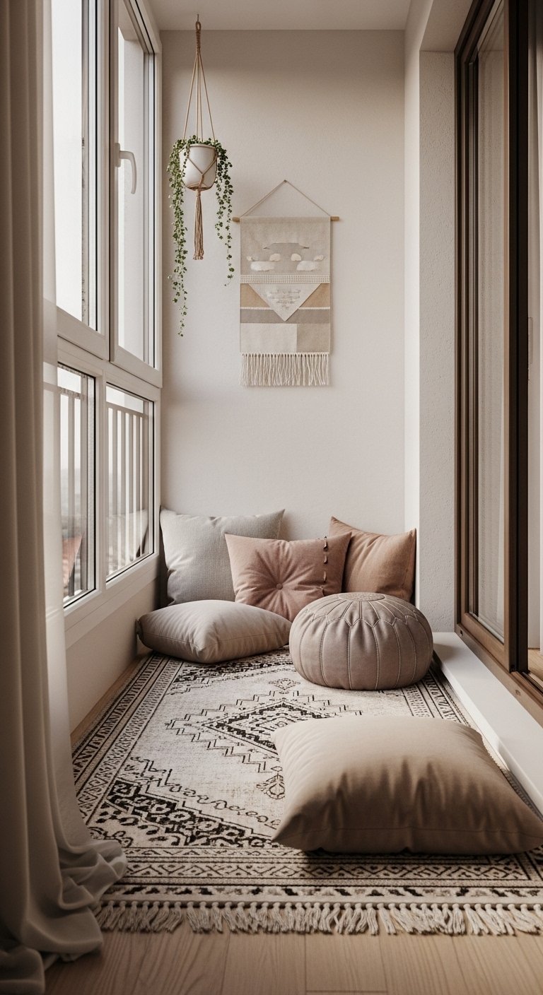Start by turning your balcony into a soft seating corner that feels relaxed the moment you step outside. Use a thick floor mattress or a folded duvet as the base, then layer it with large cushions in different textures like cotton, linen, and soft knit. Stick to a calm palette such as off white, beige, and light brown so the space feels open and peaceful instead of crowded.