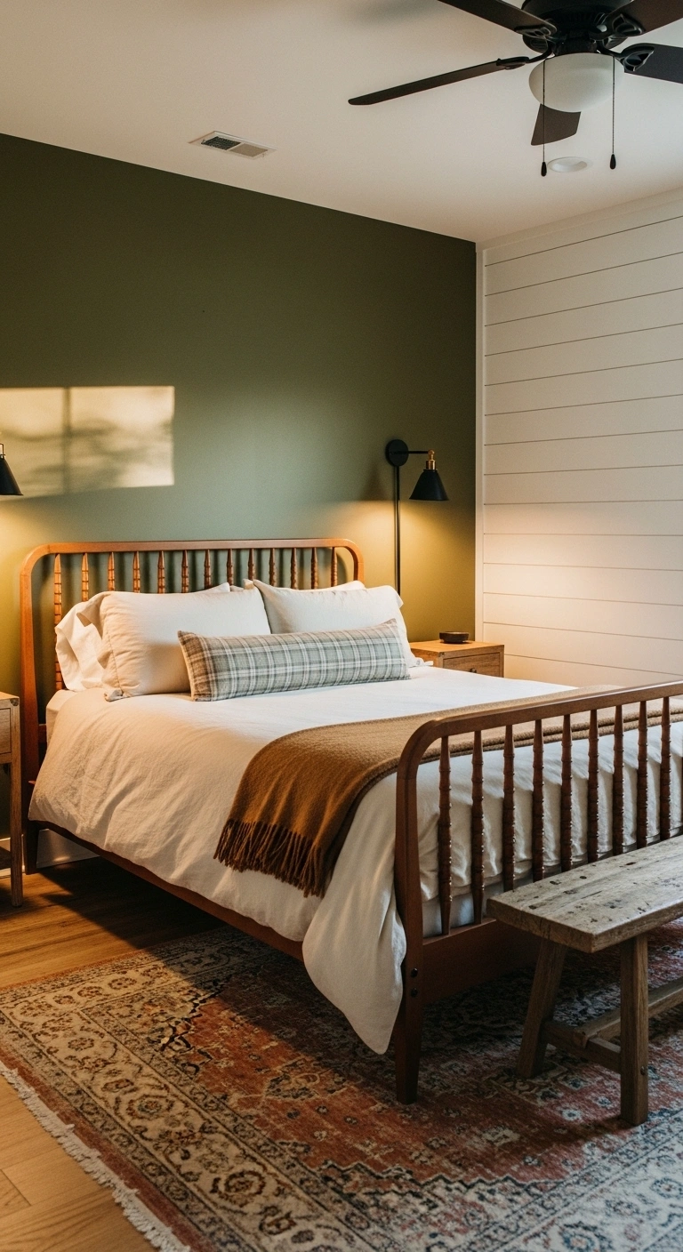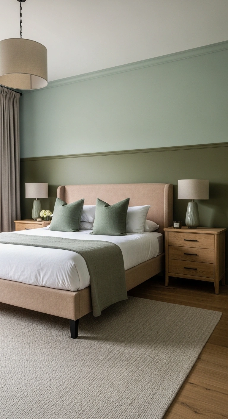 Two-tone green walls create instant depth without feeling heavy. Use a lighter sage on the upper half and a deeper olive on the lower half for balance. This split-wall design feels modern yet calm and structured. Add crisp white bedding to keep the room feeling open. Light oak nightstands soften the contrast beautifully. The overall look feels styled, layered, and thoughtfully intentional.