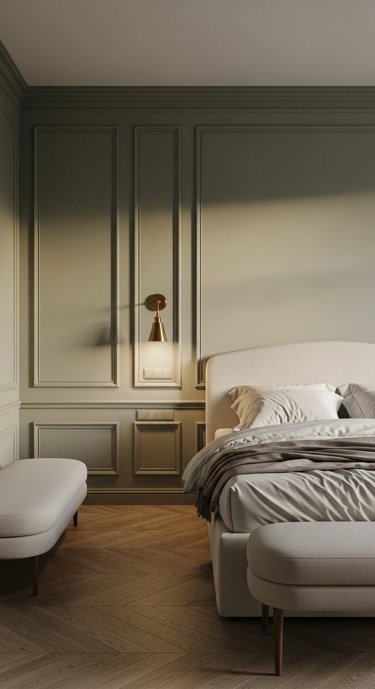 Choose a satin finish for a soft glow without harsh shine. Keep decor simple so the panel design remains the focal point. Add a textured bench at the foot of the bed for warmth. Use layered curtains in neutral shades to soften the edges. Install dimmable lighting to highlight the wall details at night. This idea adds depth without overwhelming small spaces.