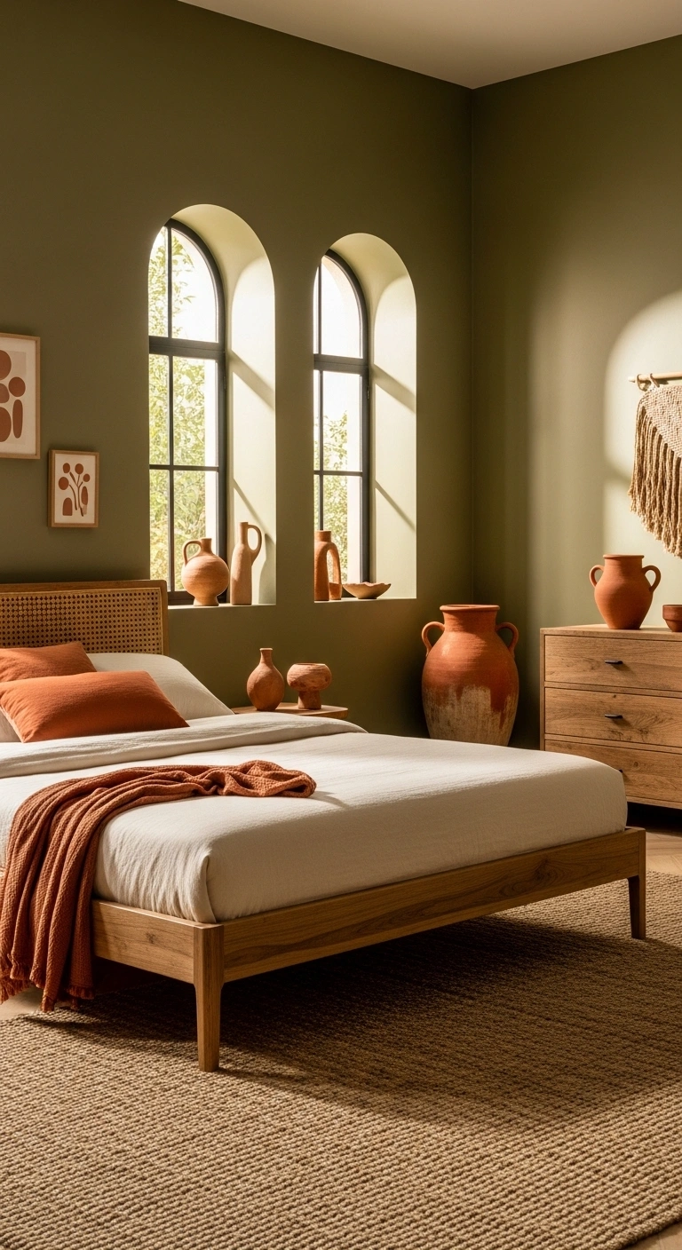 Green and terracotta create a warm, grounded bedroom palette. Pair soft olive or sage walls with terracotta throw pillows and clay-toned decor. The combination feels natural and sun-kissed rather than bold. Add light wood furniture and woven textures for organic balance. Warm white lighting enhances the earthy mood beautifully. The space feels cozy yet airy at the same time.