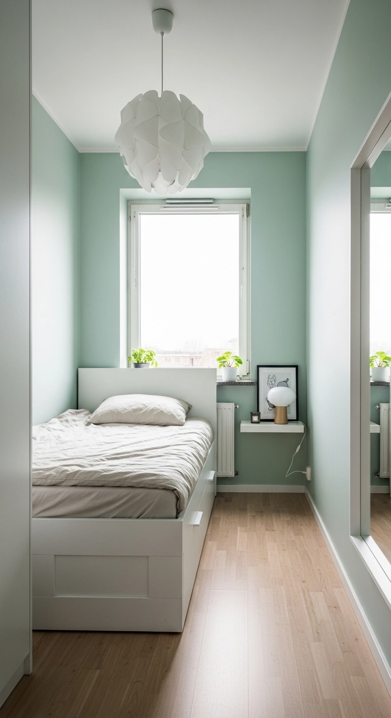 Soft mint green makes a small bedroom feel fresh and open. This light green tone reflects natural light beautifully. Pair it with white trim and light beige bedding for brightness. Add minimal wall art to avoid visual clutter. Use slim furniture pieces to keep the layout breathable. The room instantly feels larger and calmer.