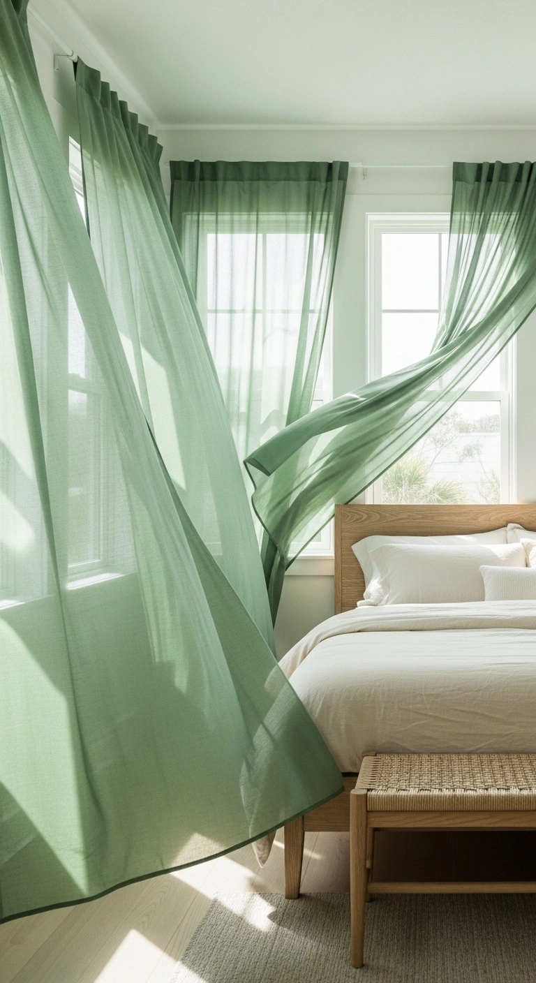 Green sheer curtains add gentle color without heavy commitment. Choose a soft sage or eucalyptus tone that filters sunlight beautifully. When daylight passes through, the room feels calm and glowing. Pair with neutral bedding and light wood flooring. The flowing fabric adds movement and softness instantly. The effect feels romantic yet minimal.