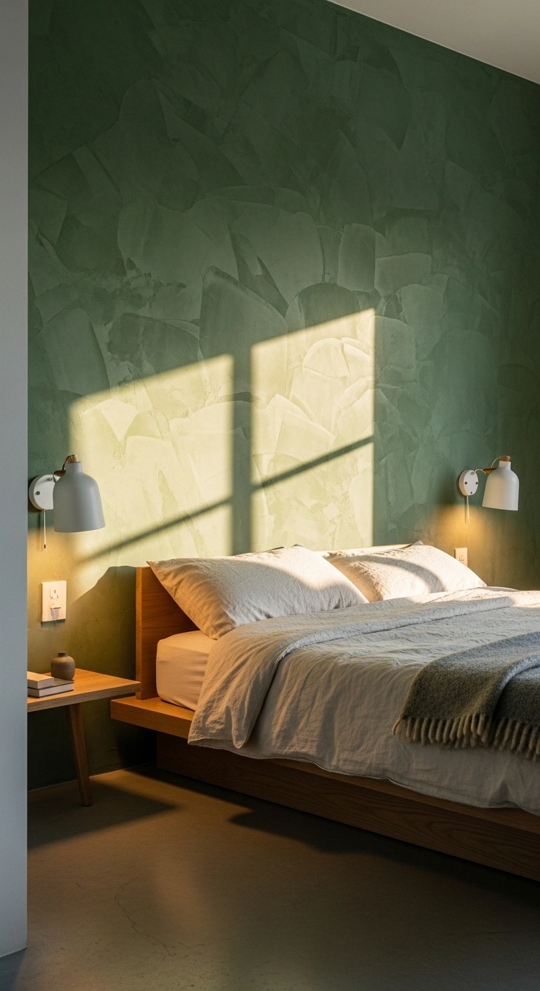 A textured green plaster wall adds artistic depth to a bedroom. Choose a muted moss or clay-green tone for a natural look. The uneven surface reflects light differently throughout the day. Pair it with simple bedding in soft cream or beige. Add wooden furniture to keep the mood organic. The space feels handcrafted and calming.