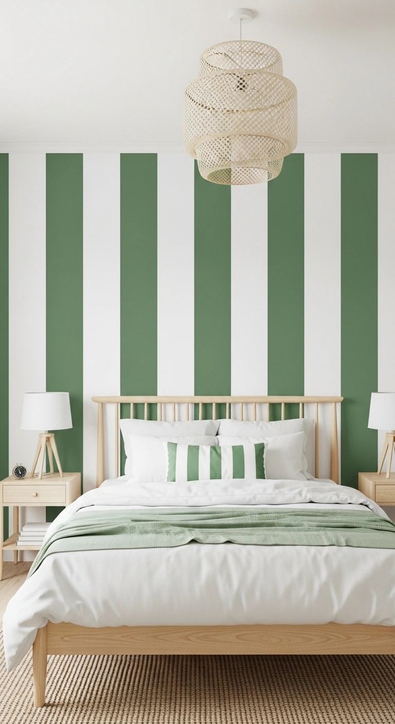 Green and white stripes create playful structure in a bedroom. Use soft sage stripes against a clean white background. Vertical stripes make ceilings appear taller and brighter. Pair with simple white bedding and minimal decor. Add natural wood furniture to soften the graphic effect. The room feels fresh, crisp, and subtly bold.