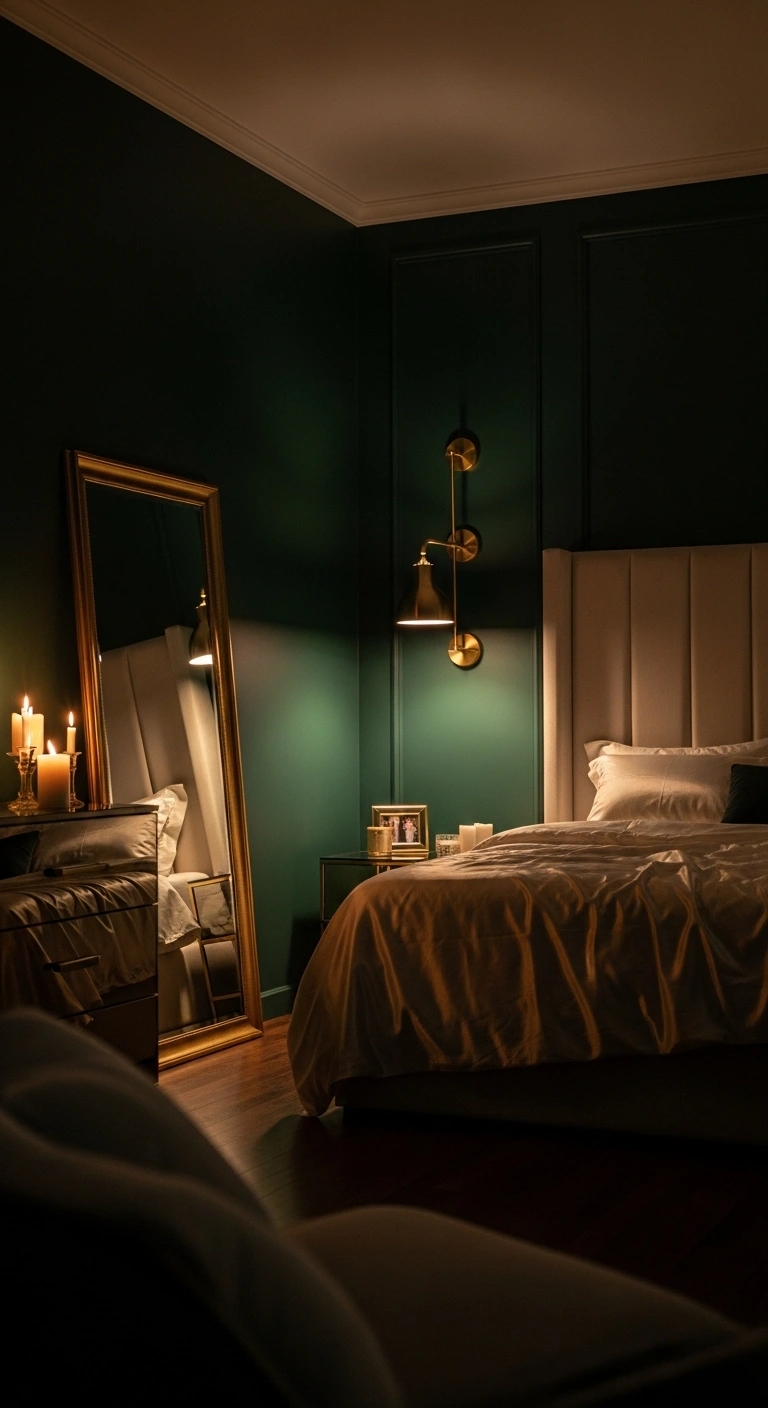 Moody green walls paired with soft gold accents feel rich and soothing. Choose a deep emerald or dark olive tone. Add gold-framed mirrors and warm metallic lamps. Keep bedding in soft ivory or taupe for balance. The warm metal tones glow beautifully against dark green. The room feels dramatic yet restful.