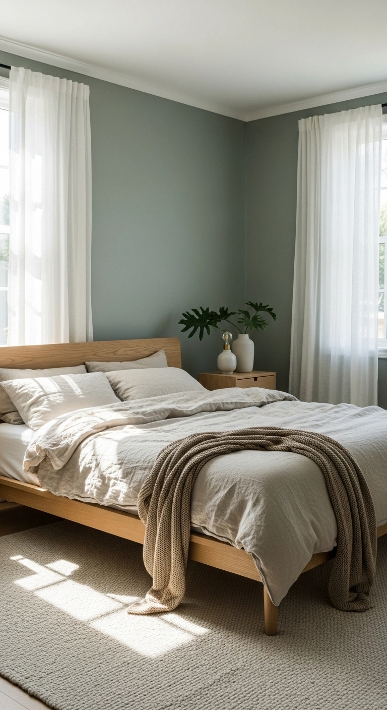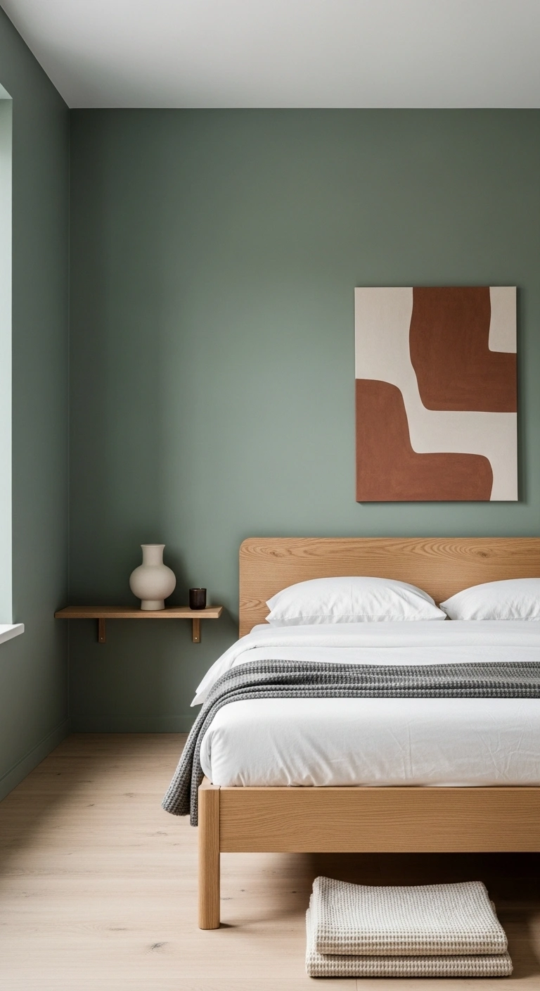 Sage green walls create a soft and peaceful bedroom atmosphere instantly. This muted green feels gentle, slightly gray, and beautifully balanced under natural light. Pair it with warm ivory linen bedding and light oak furniture for an effortless look. Add woven baskets, a textured area rug, and sheer white curtains to keep the room airy. In the evening, warm bedside lamps make the sage tone glow softly. The overall mood feels clean, fresh, and quietly elegant without looking plain.