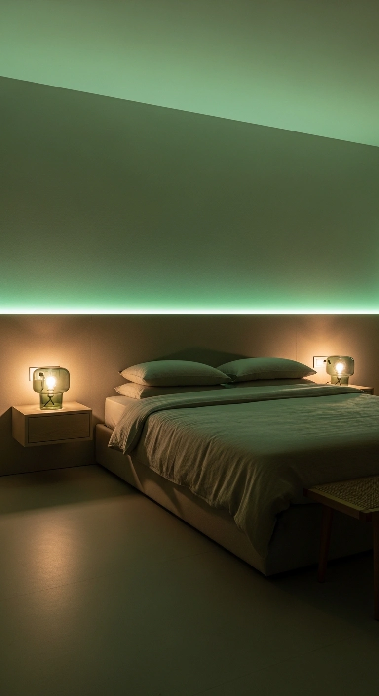 Green layered lighting focuses on mood rather than paint. Use green glass lamps, tinted shades, or subtle LED backlighting. The soft glow creates a relaxing nighttime atmosphere. Pair with neutral walls to keep balance. Add textured bedding for warmth and softness. The room feels serene and inviting after sunset.
