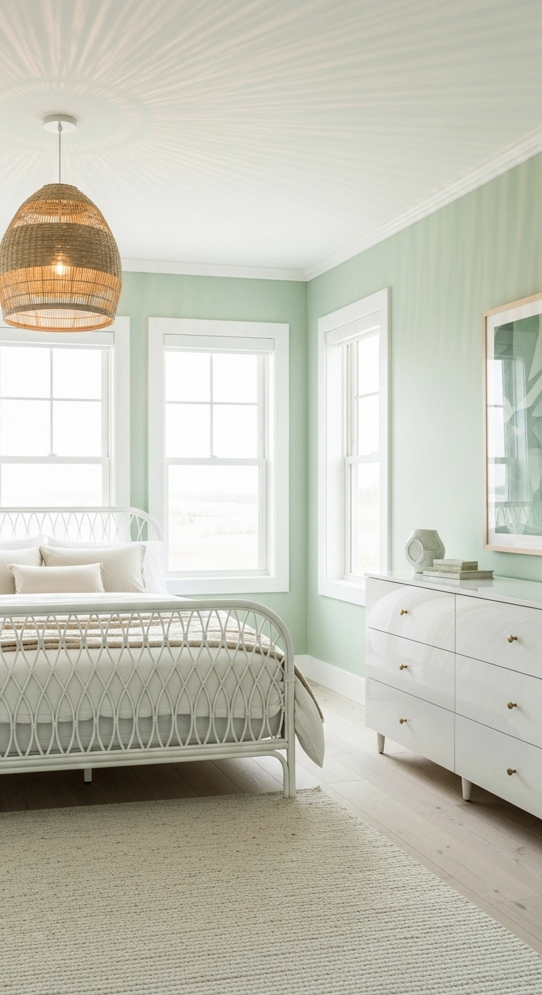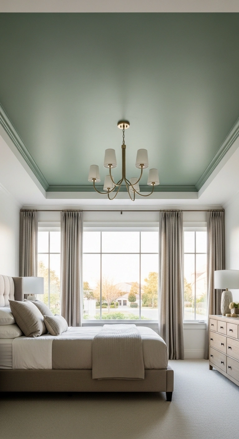 Choose a soft dusty green rather than a bold tone. Keep wall decor minimal to let the ceiling stand out. Add vertical elements like tall curtains to draw the eye upward. Use neutral bedding to avoid color competition. Install dimmable lighting for evening softness. This works beautifully in modern and classic homes alike.