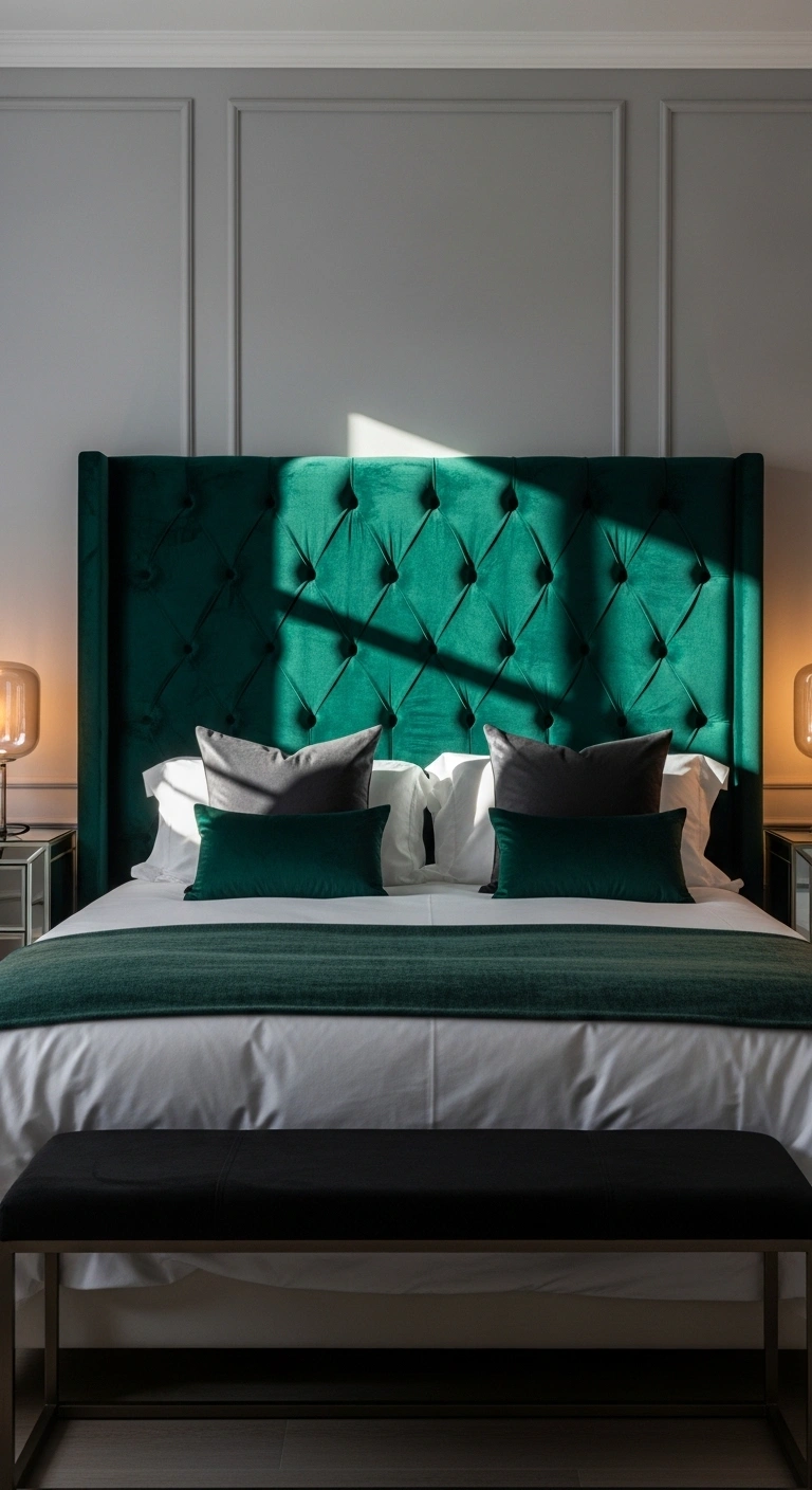 Choose a tall upholstered headboard to make the room feel grand. Keep surrounding walls neutral so emerald becomes the hero. Add a soft gray or cream area rug to anchor the bed visually. Use layered lighting like table lamps and overhead dimmers to highlight the velvet texture. Keep bedside decor minimal for a clean finish. This works beautifully in both modern and classic bedroom styles.