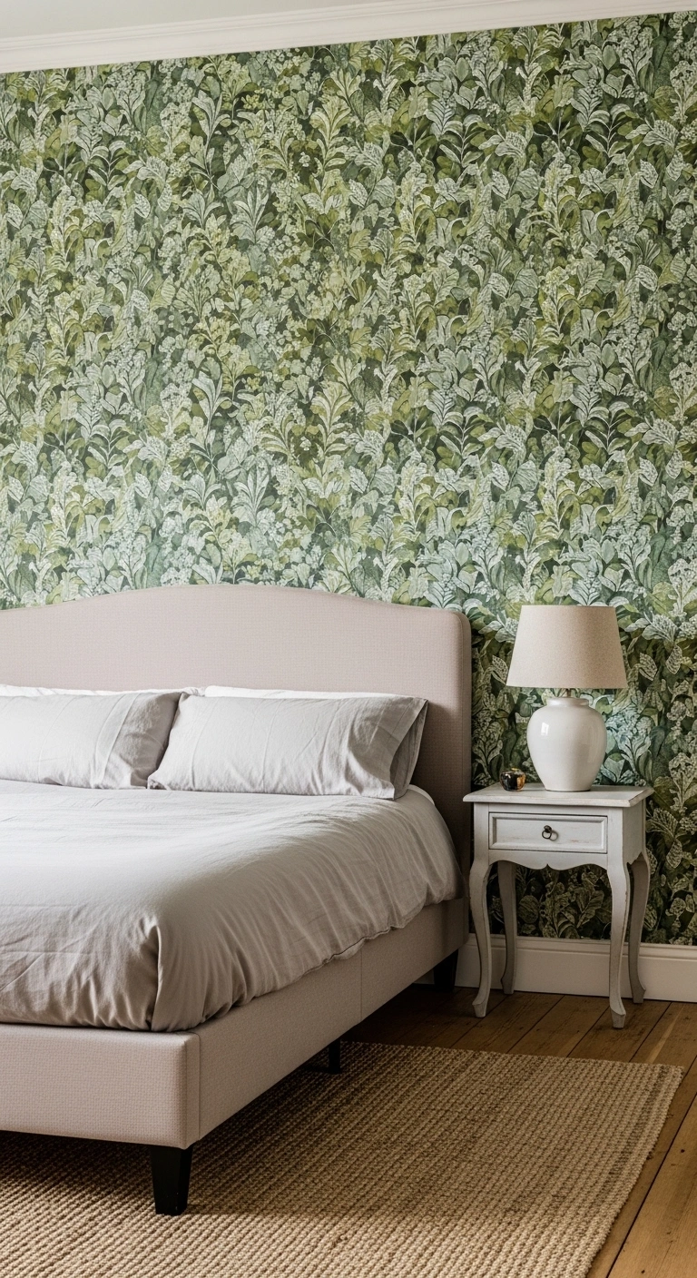 A botanical green wallpaper instantly brings nature indoors. Choose a design with leafy patterns in multiple green tones for depth. This creates visual interest while still feeling calm. Pair it with simple bedding in solid neutral colors. Light wood furniture helps the pattern feel grounded and organic. Soft warm lighting enhances the natural theme beautifully.