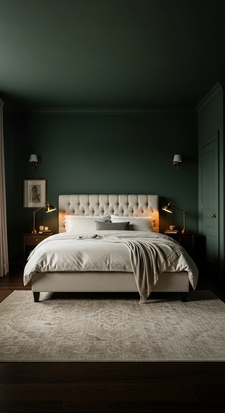 If you use forest green on all walls, balance it with lighter textiles. Choose large mirrors to reflect light and prevent heaviness. Keep ceiling paint white or off-white to maintain height. Add brass or gold accents for subtle brightness. Use soft layered bedding for comfort and visual softness. This design works beautifully in larger bedrooms with good natural light.