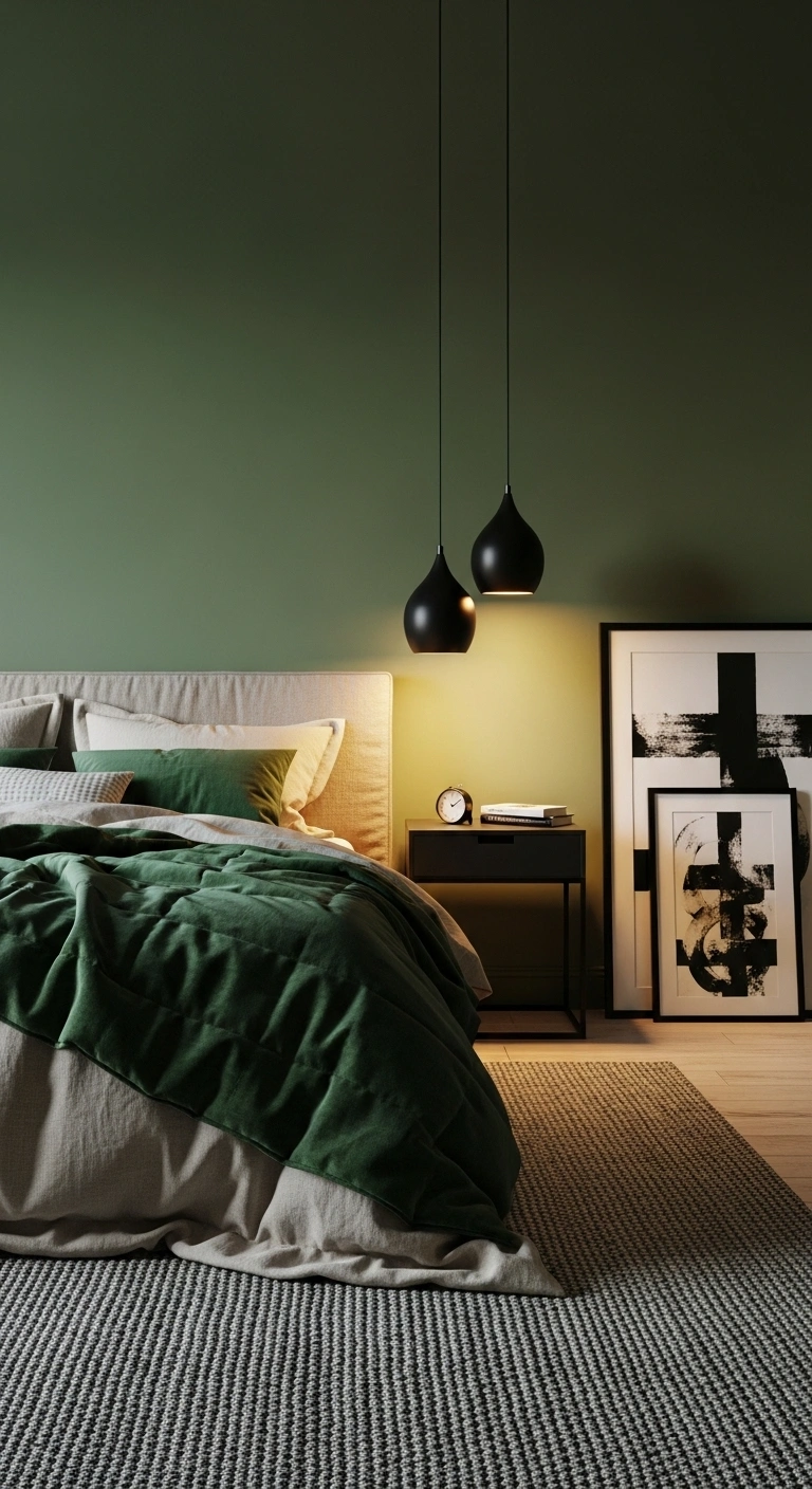 Moss green offers a soft earthy tone with subtle depth. It feels grounded but not dark, making it perfect for balanced bedrooms. Pair moss green walls with black light fixtures and framed artwork. Add beige bedding and textured throws for softness. The contrast between green and black feels modern yet organic. The room feels stylish without losing warmth.