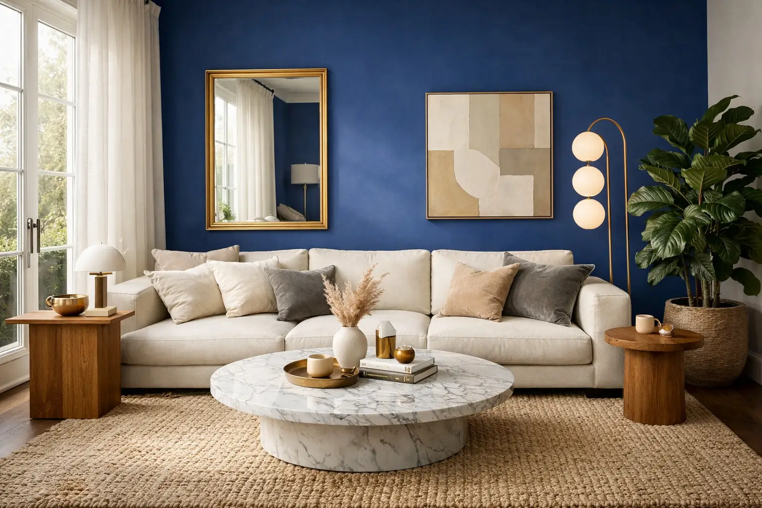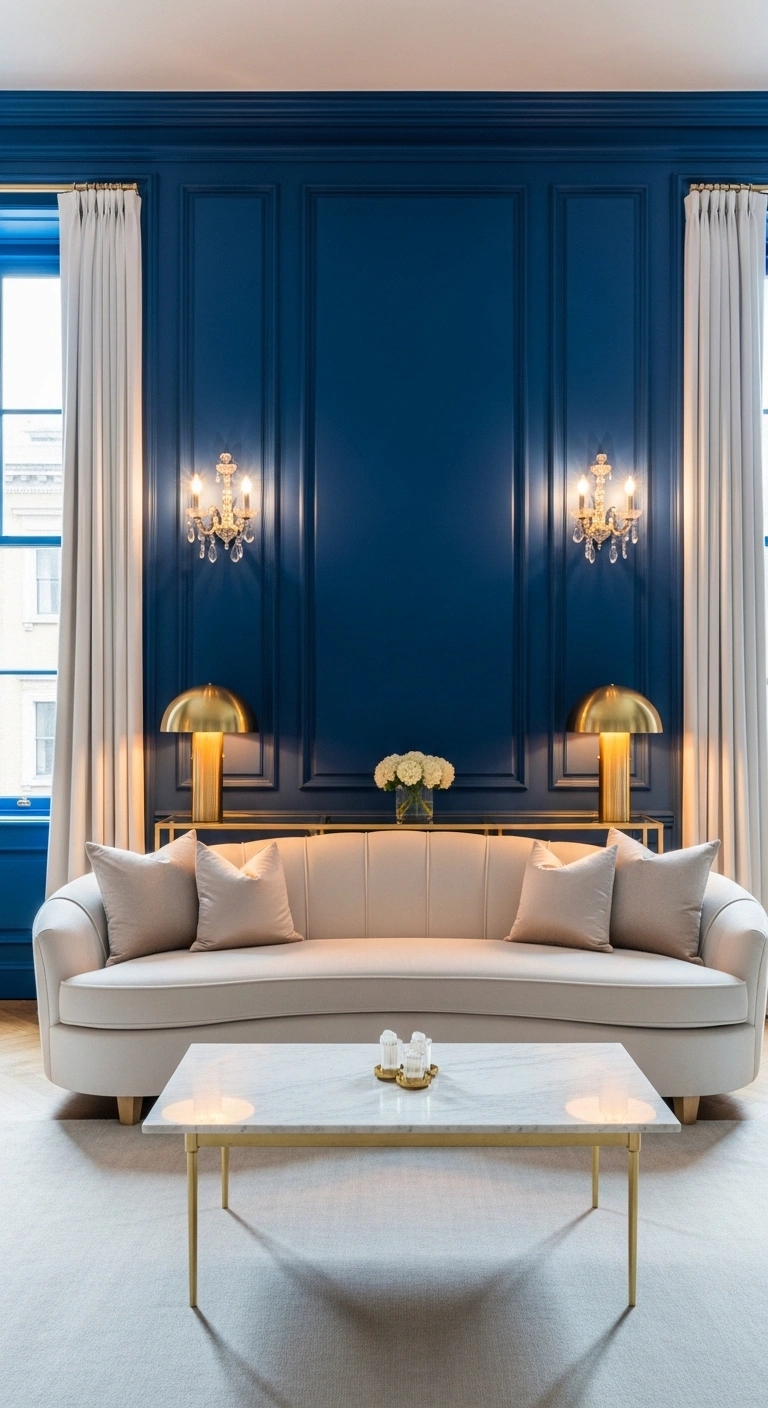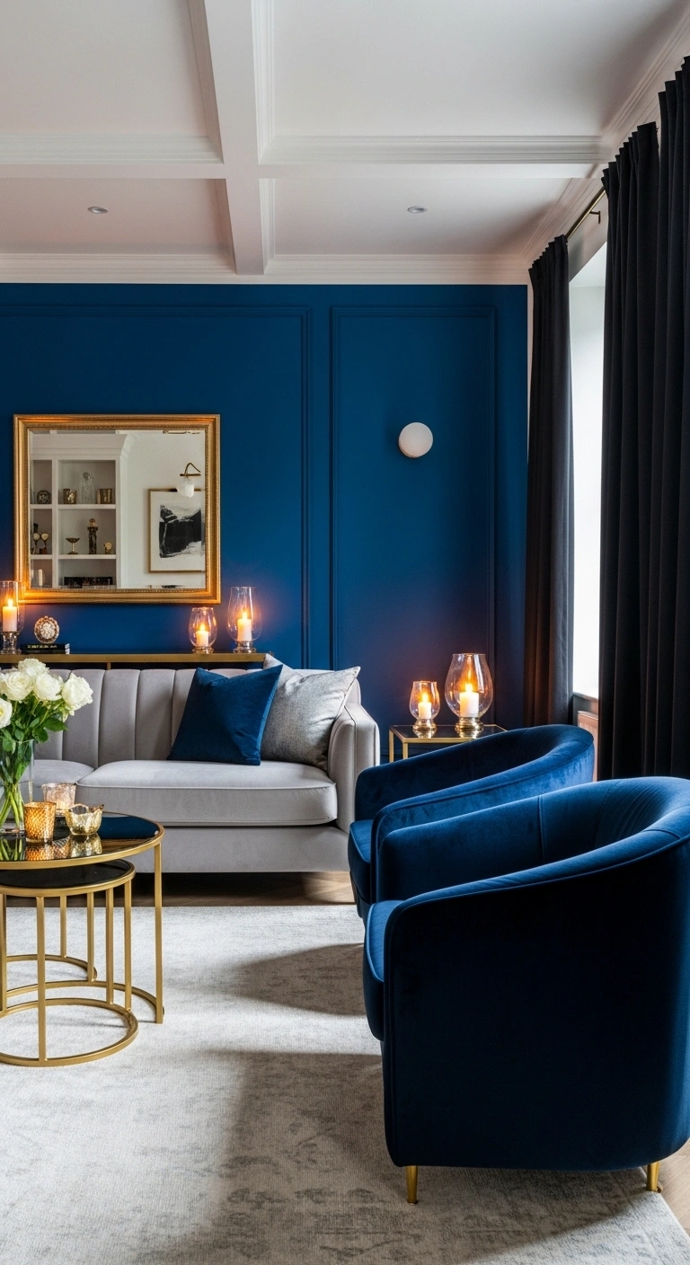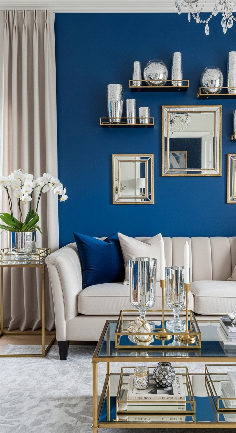 Glass and brass décor pieces help a cobalt blue accent wall feel lighter and more refined. The reflective surfaces catch light and prevent the deep blue from making the room feel too heavy. This creates a living room that feels bright, elegant, and layered.
