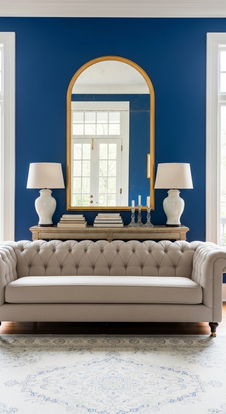 11. Cobalt Blue Accent Wall with Gold Framed Mirror