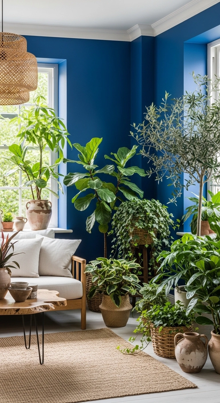 12. Cobalt Blue Wall with Indoor Plants Display