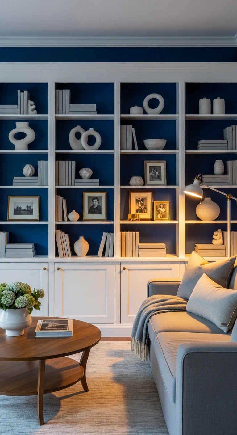 Painting the wall behind a white built-in bookcase in cobalt blue creates strong contrast and gives ordinary shelving a designer look. The white shelves pop against the deep background, making books and décor stand out more clearly.