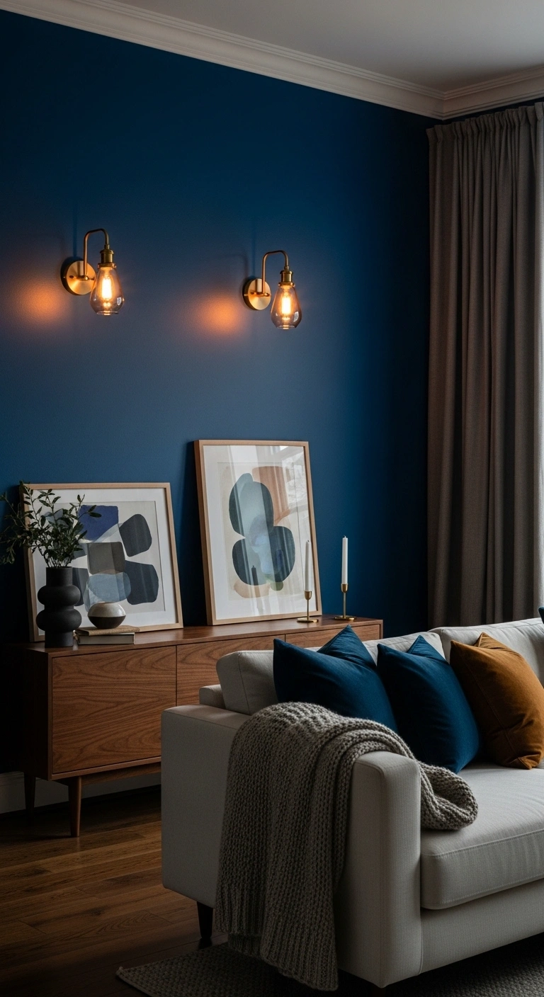 Choose brass, matte black, or frosted glass sconces depending on your style. Place them evenly behind a sofa, beside artwork, or near a reading chair. Soft warm bulbs help the cobalt shade feel deeper and more inviting. Pair the wall with cream textiles and wooden furniture to soften the bold tone. This idea works especially well for cozy evening spaces where lighting matters just as much as color.