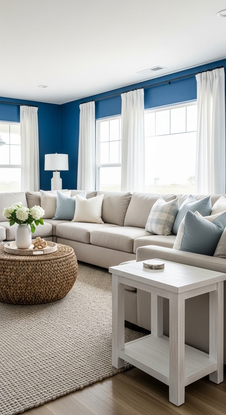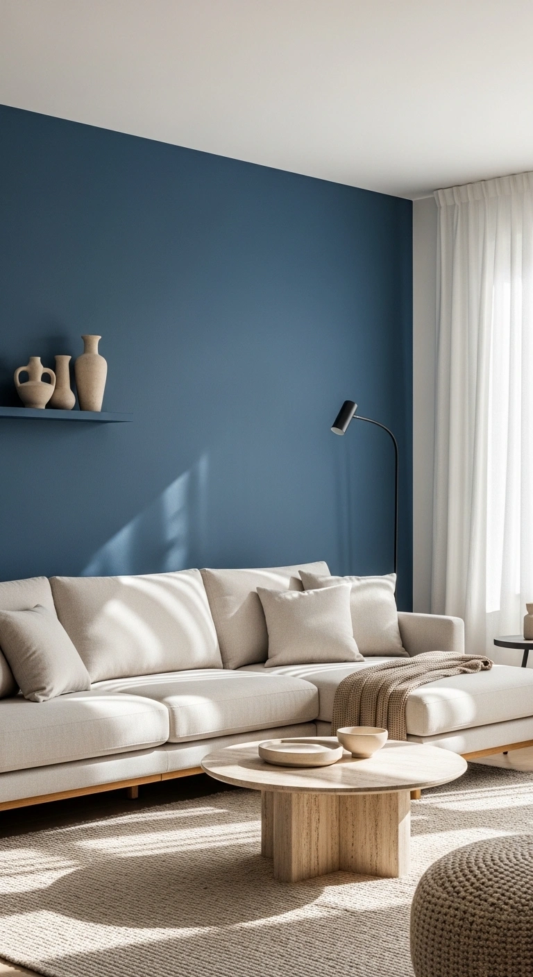 A large neutral sectional placed against a cobalt blue accent wall creates comfort without losing bold design impact. The soft tones of beige, cream, or light gray allow the blue to stay the main feature while the seating keeps the room calm and inviting.