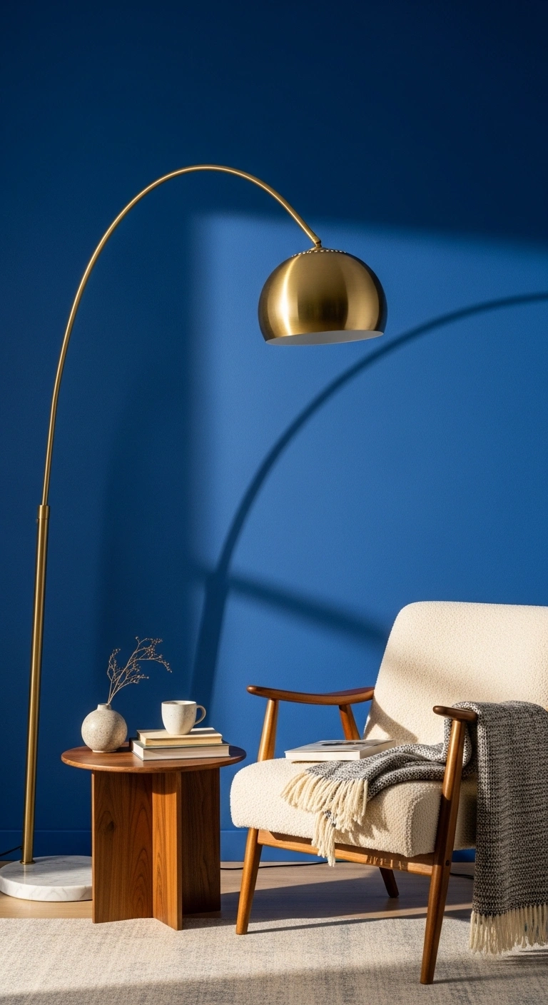 An arched floor lamp placed in front of a cobalt blue accent wall adds shape and elegance while improving lighting in the living room. The curved line of the lamp breaks up the strong flat wall and creates a softer visual flow.