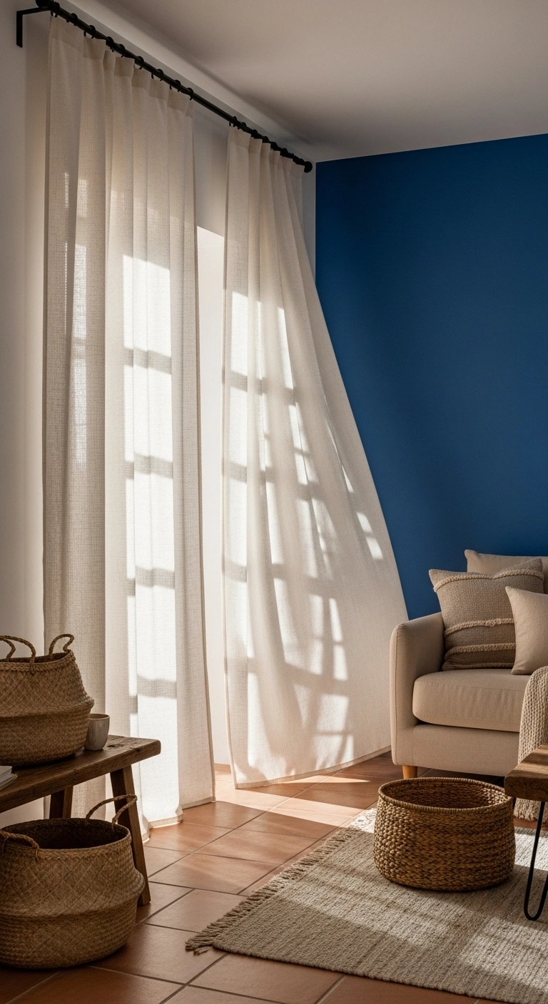 Choose off-white, oatmeal, or soft beige curtains to keep the room bright and airy. Let the curtains hang from ceiling height to make the room feel taller and more spacious. Add wooden curtain rods or matte black hardware for extra detail. A neutral sofa and woven baskets complete the cozy look. This idea is perfect for people who want bold color without losing a soft and comfortable home feeling.