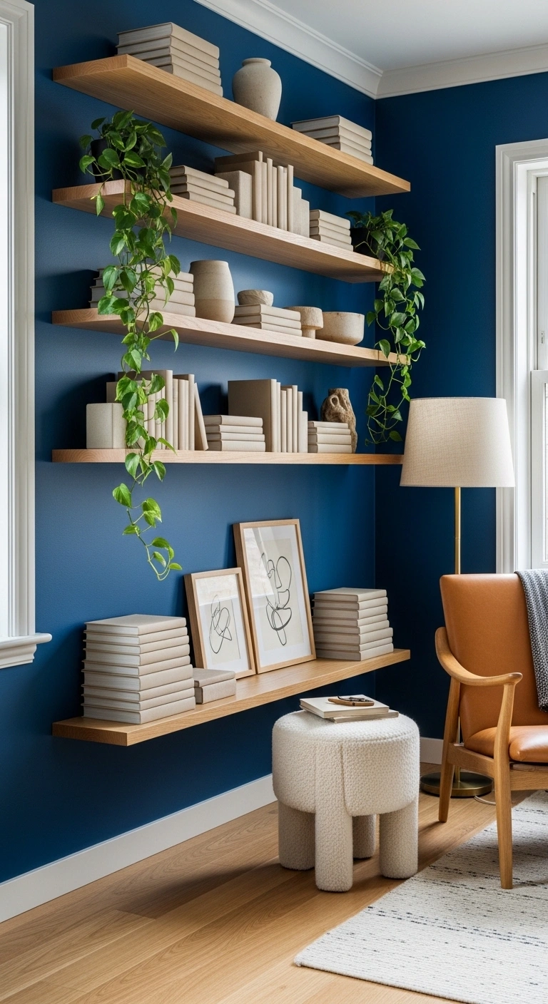 Style the shelves with stacked books, ceramic vases, framed art, and trailing plants for softness. Keep the shelf décor light in color so it stands out clearly against the deep blue. A tan leather chair nearby adds warmth and creates a cozy reading corner. This design works well in both large and small living rooms because it adds function without bulky furniture. The contrast between the wood and cobalt blue feels rich, clean, and highly save-worthy for Pinterest inspiration.