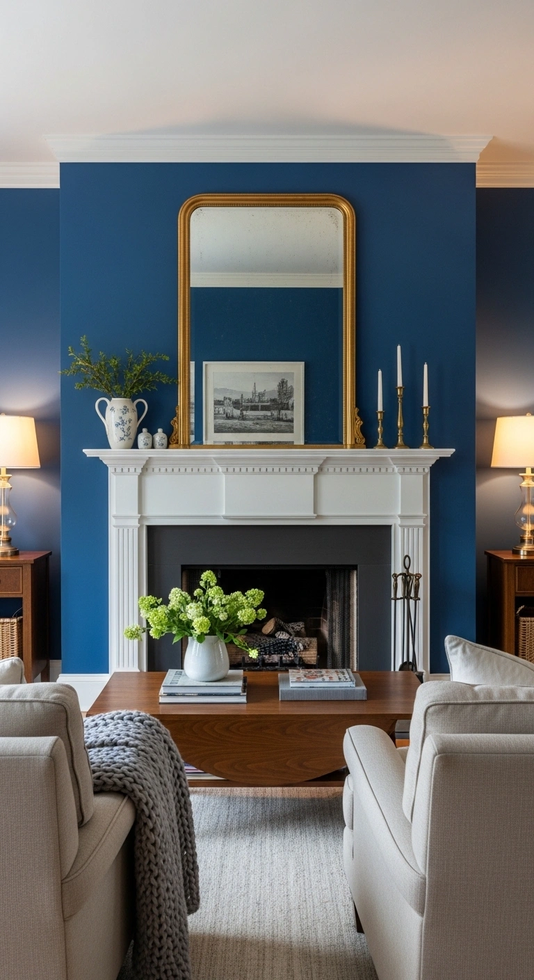 White fireplace trim looks crisp against the bold blue, while brass candle holders or gold-framed mirrors add warmth above the mantel. If your fireplace is brick, painting only the surrounding wall can create contrast without losing texture. Add soft beige seating nearby and a chunky knit throw for balance. Warm lighting from table lamps makes the blue feel deeper and more inviting at night. This idea works beautifully in homes that need one strong focal point without adding too much furniture or decoration.