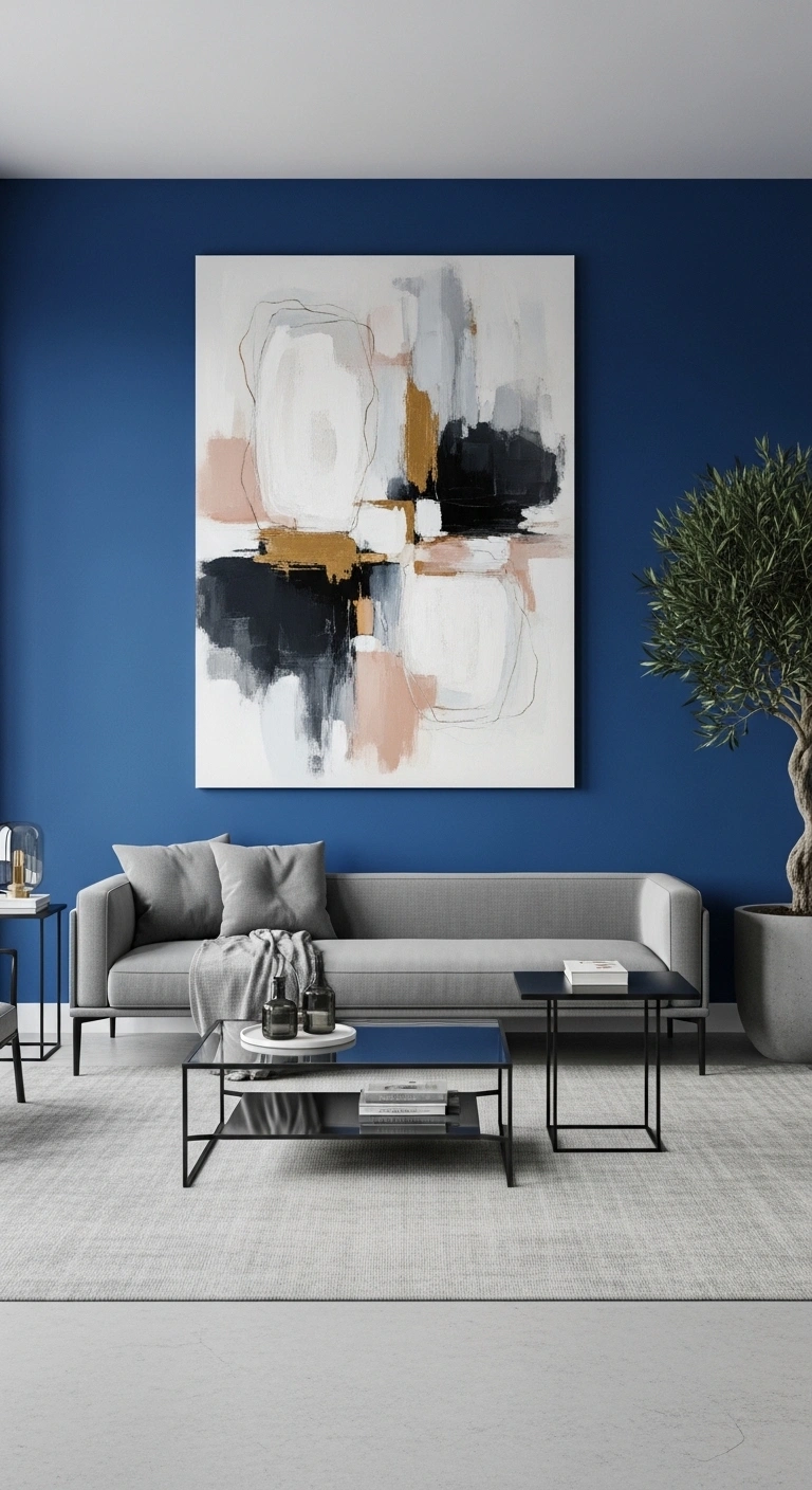 A large piece of abstract art on a cobalt blue accent wall creates a gallery-style living room that feels polished and personal. Instead of many small decorations, one oversized artwork makes a stronger statement.