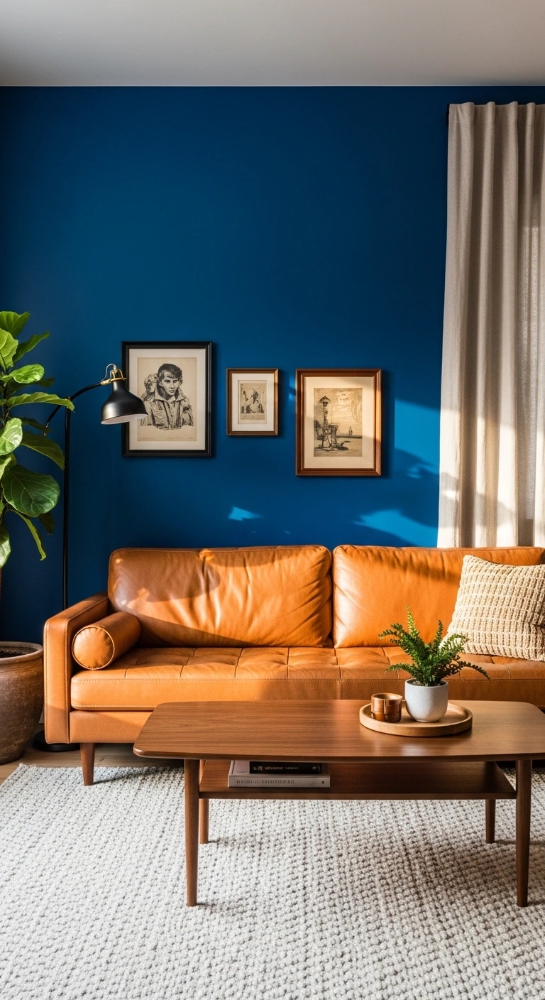 A cognac leather sofa against a cobalt blue accent wall creates one of the strongest and most stylish color combinations for a living room. The warm caramel tone of leather balances the cool boldness of blue beautifully.