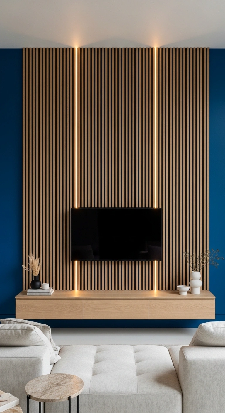 Vertical wood slats over a cobalt blue accent wall add texture and architectural detail that feels custom-designed. This idea works especially well for modern living rooms that need warmth and depth.