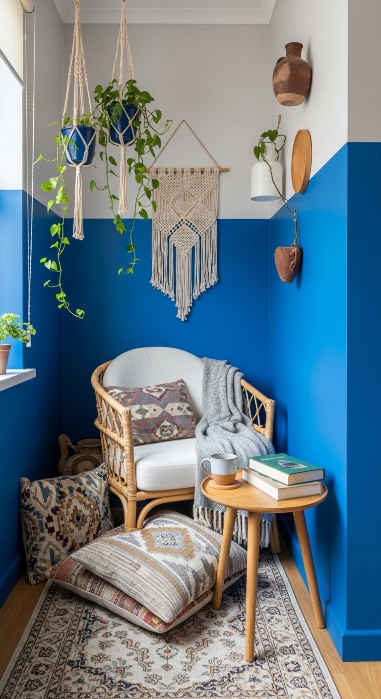 Small living rooms do not always need a full accent wall. Painting just one corner in cobalt blue can create strong visual interest without making the room feel smaller. This is perfect for apartments or compact spaces.
