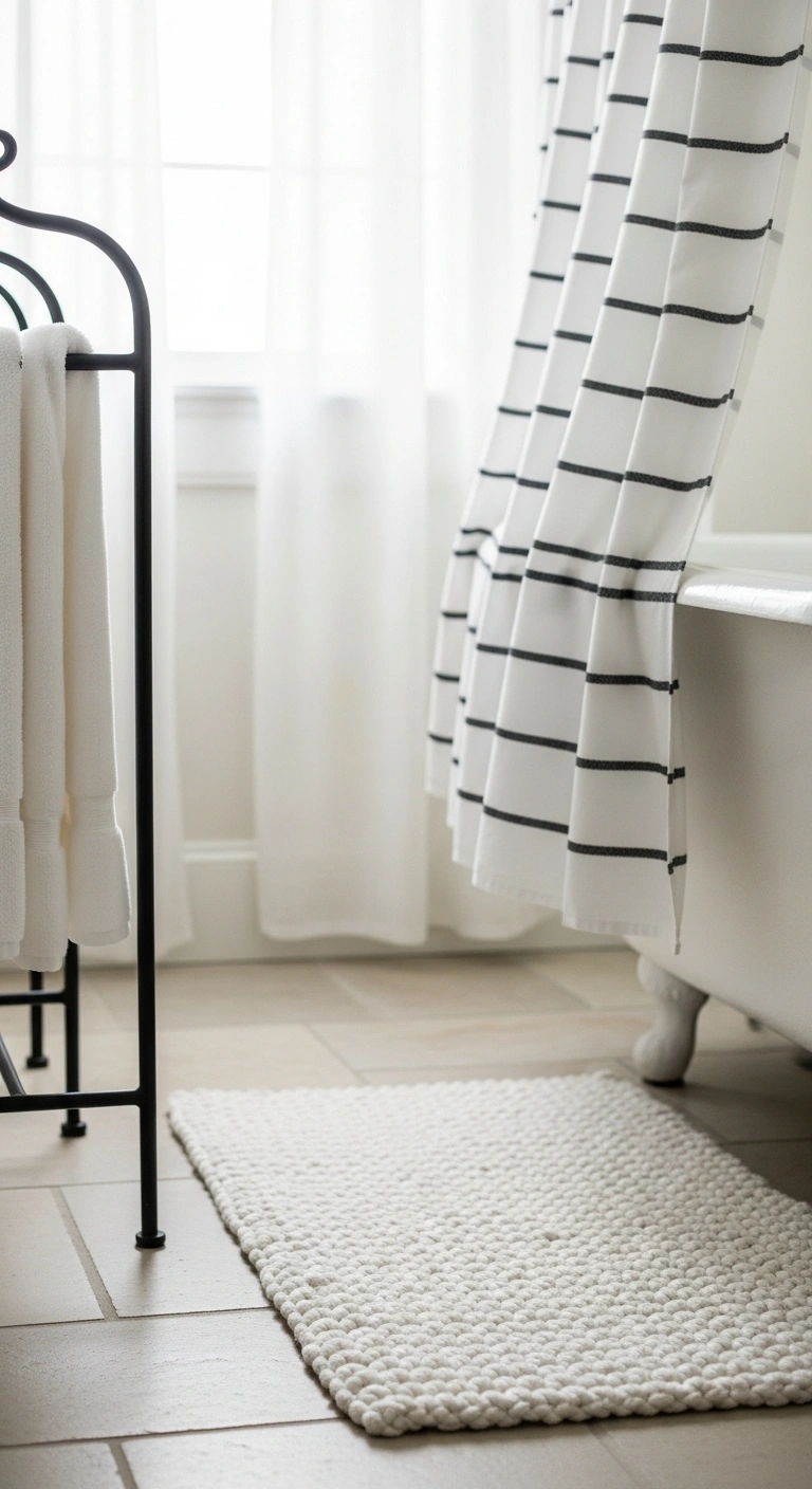 Soft textiles prevent a black and white bathroom from feeling cold. Use thick white towels and a textured bath rug. Add a simple black-striped shower curtain for subtle pattern. The fabrics bring warmth and comfort. The room feels inviting and livable. Texture makes the space feel layered.