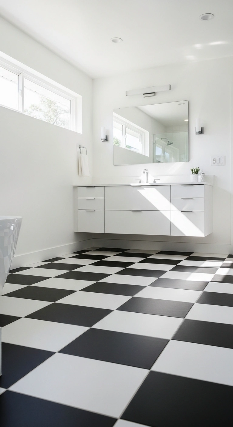 Oversized checkerboard flooring gives a black and white bathroom instant character. Large black and white tiles feel graphic, confident, and timeless. The pattern draws the eye across the room and makes small spaces appear wider. Crisp white walls keep the look fresh and uncluttered. Soft daylight enhances the contrast without making it harsh. The overall effect feels vintage yet completely current.