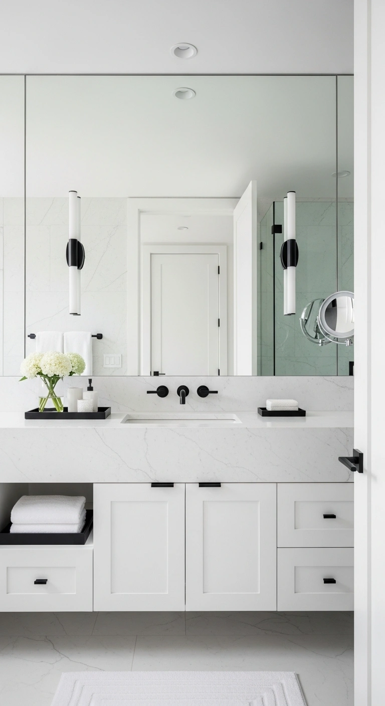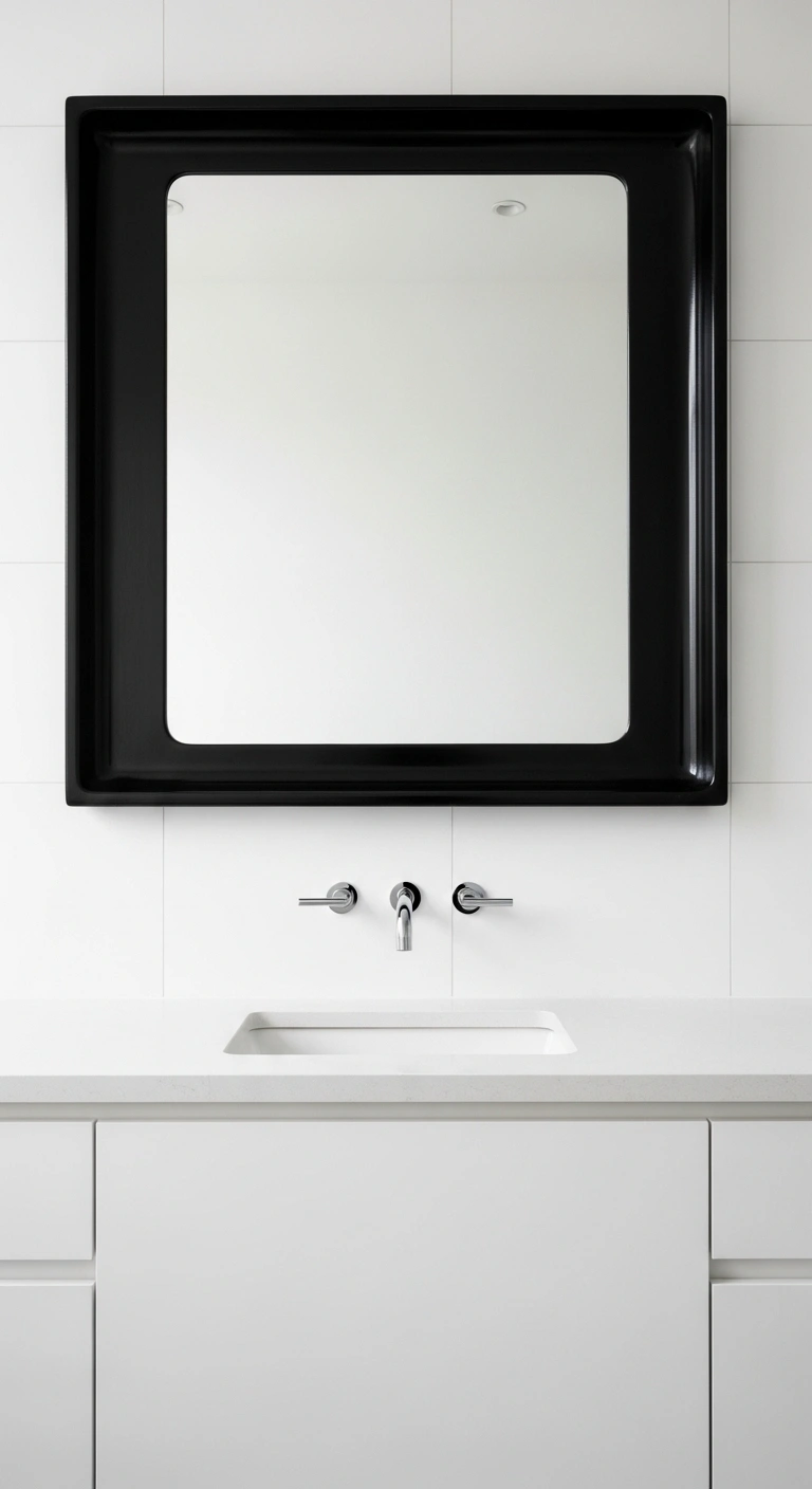 A bold black mirror frame instantly defines the vanity area. It creates structure against white walls and reflects light beautifully. The strong outline feels intentional and graphic. When paired with white countertops and light tiles, it becomes the star of the room. The space feels styled and cohesive. The contrast looks clean and confident.