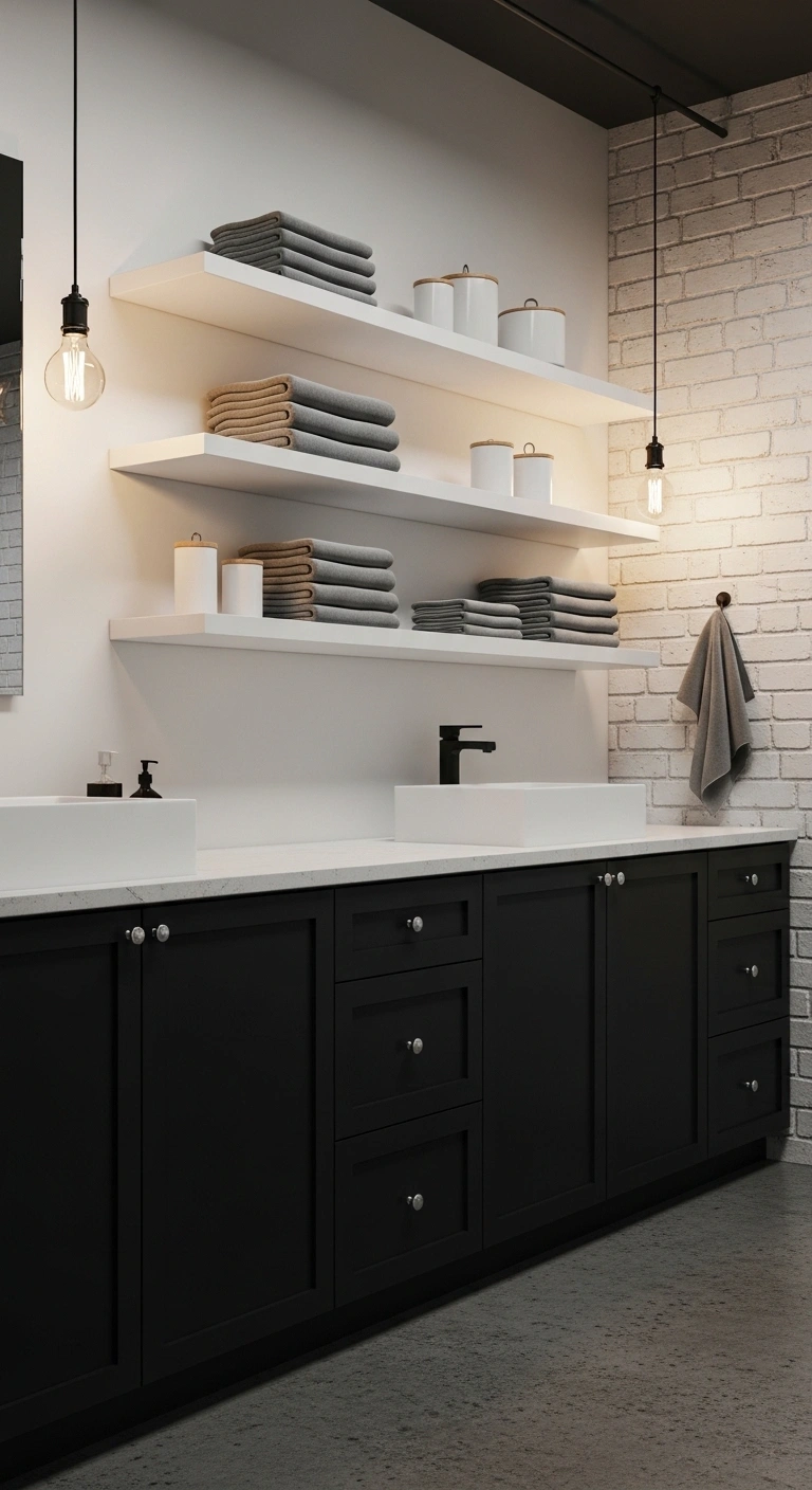 Black lower cabinets ground the bathroom beautifully. White open shelves above keep the room feeling light and breathable. The contrast creates balance between heavy and airy elements. Rolled white towels and clear glass jars look crisp against white shelving. Black cabinetry adds depth without overwhelming the room. The design feels practical and visually interesting.