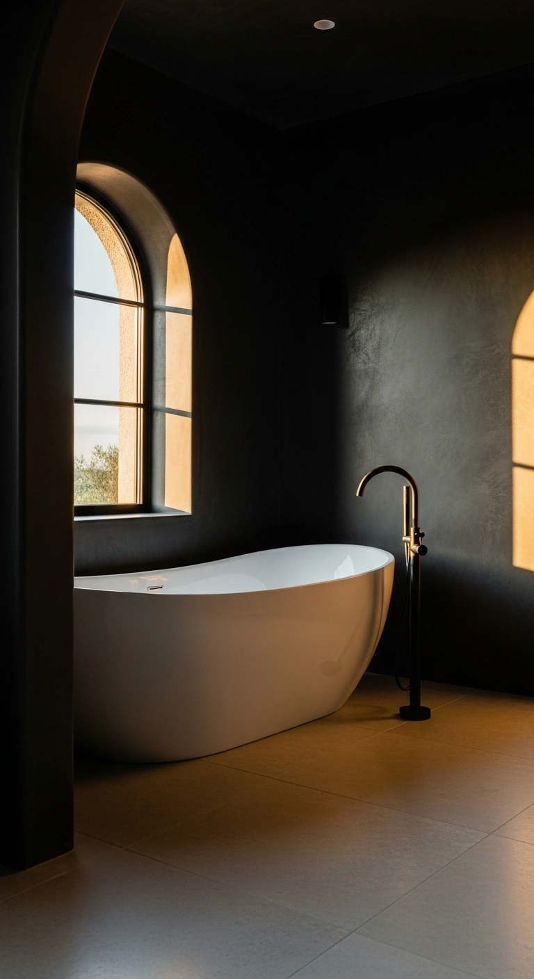 Keep surrounding décor minimal to maintain calm energy. Install warm wall lights to soften dark tones. Add a small wooden bath tray for warmth and practicality. Use light flooring to prevent the space from feeling enclosed. This setup works best in bathrooms with decent natural light.