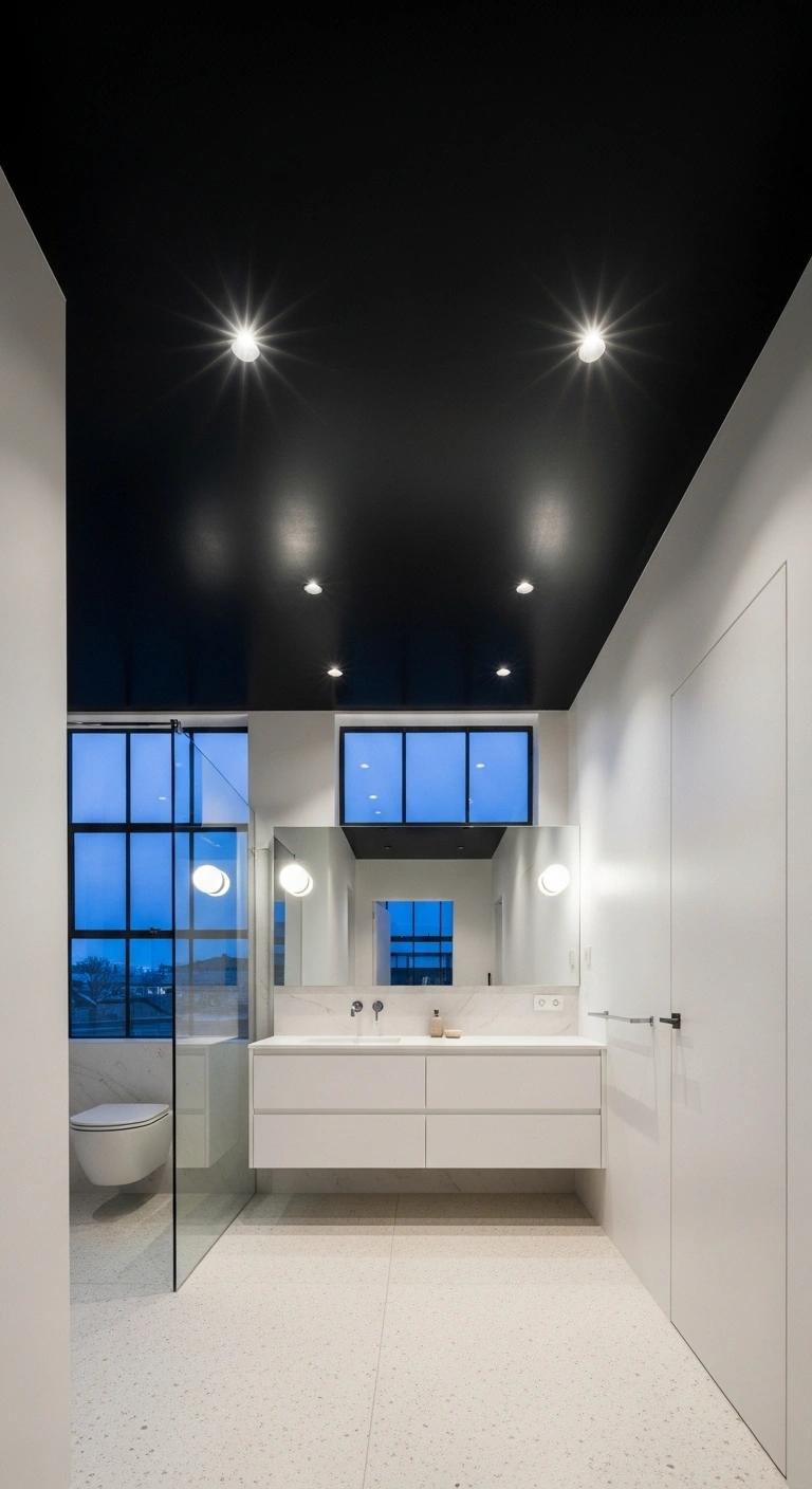 A black ceiling creates a cozy, dramatic atmosphere. It draws the eye upward and adds unexpected depth. Against white walls and light flooring, it feels bold yet balanced. Soft lighting makes the ceiling appear velvety and smooth. The room feels intimate and thoughtfully designed. It transforms an ordinary bathroom into a statement space.