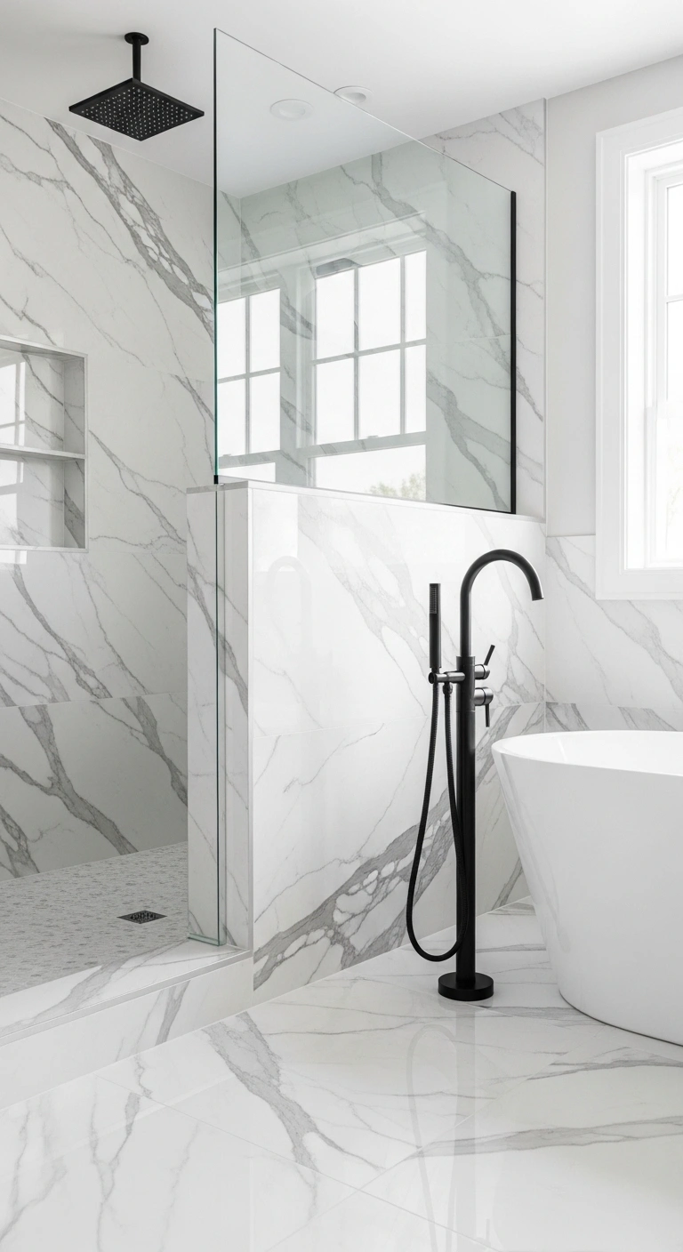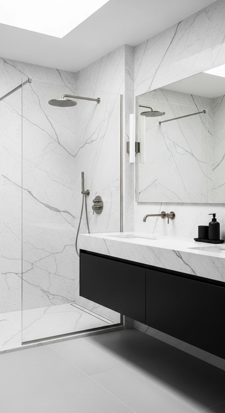 White surfaces with delicate black veining soften the contrast naturally. The subtle pattern blends both colors in one elegant material. Countertops or shower walls with light veining feel organic and refined. The texture adds quiet movement without overwhelming the eye. The bathroom feels cohesive and high-end. It avoids looking too stark.