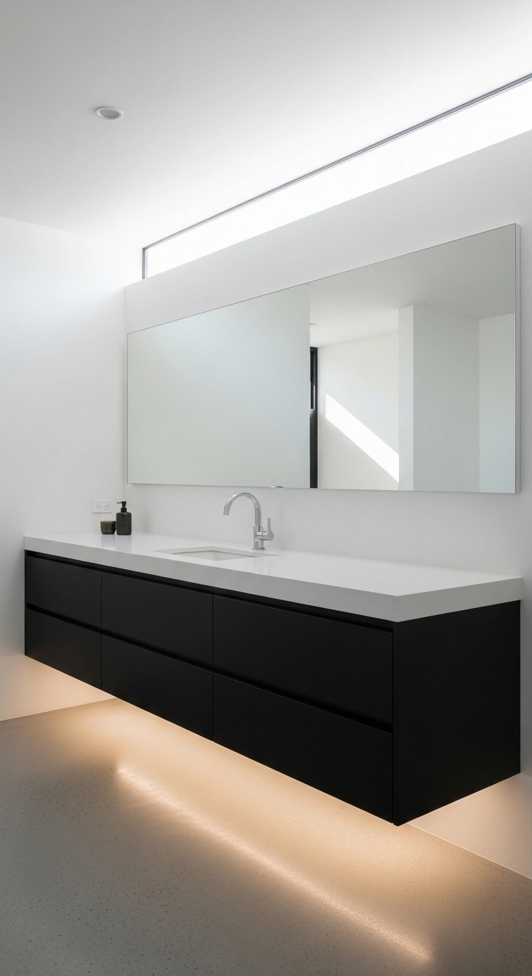 Choose a floating vanity if your bathroom feels small. The open space underneath keeps the room airy and spacious. Pair it with a large frameless mirror to bounce light around. Add a small white tray with rolled hand towels for softness. Keep décor minimal so the contrast remains the star. This approach works beautifully in both compact powder rooms and larger primary bathrooms.