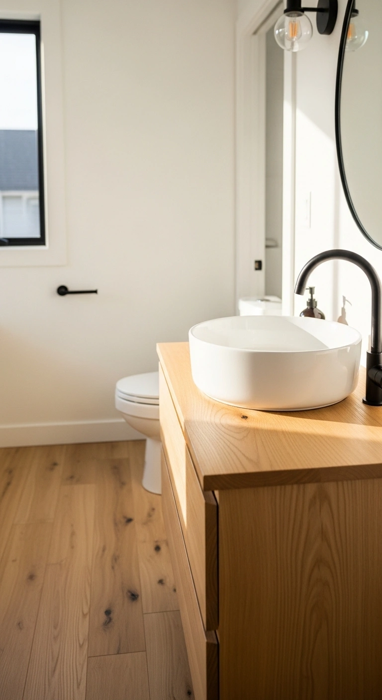 Stick to lighter wood tones for freshness. Use sealed finishes suitable for humid environments. Combine wood with matte black hardware for modern balance. Keep wood accents minimal but intentional. This subtle addition prevents the design from feeling cold.